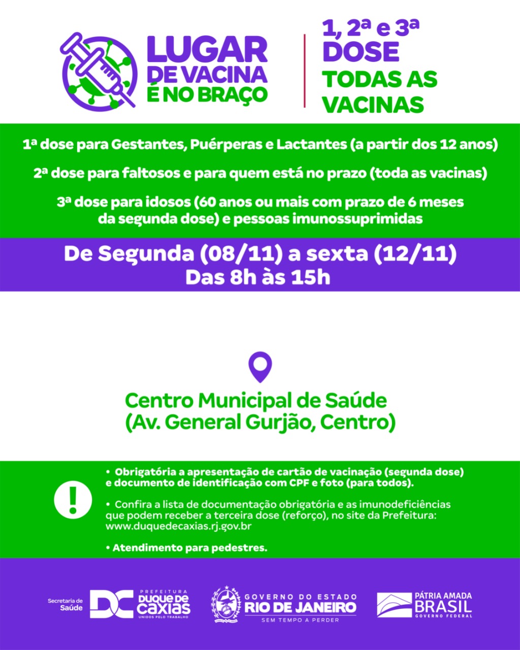 No CMSDC - Centro Municipal de Saúde (Av. General Gurjão – Centro), a vacinação segue nesta sexta, para os seguintes grupos: primeira dose para gestantes, puérperas e lactantes (a partir de 12 anos). Este grupo também pode ser vacinado no CRAESM de Xerém; segunda dose para faltosos de todas as vacinas; e terceira dose (reforço) para pessoas imunossuprimidas e idosos (com 60 anos ou mais com prazo de seis meses da segunda dose). Verifique a lista das imunodeficiências que podem receber a dose de reforço da vacina contra a Covid-19, no site da Prefeitura: (www.duquedecaxias.rj.org.br).