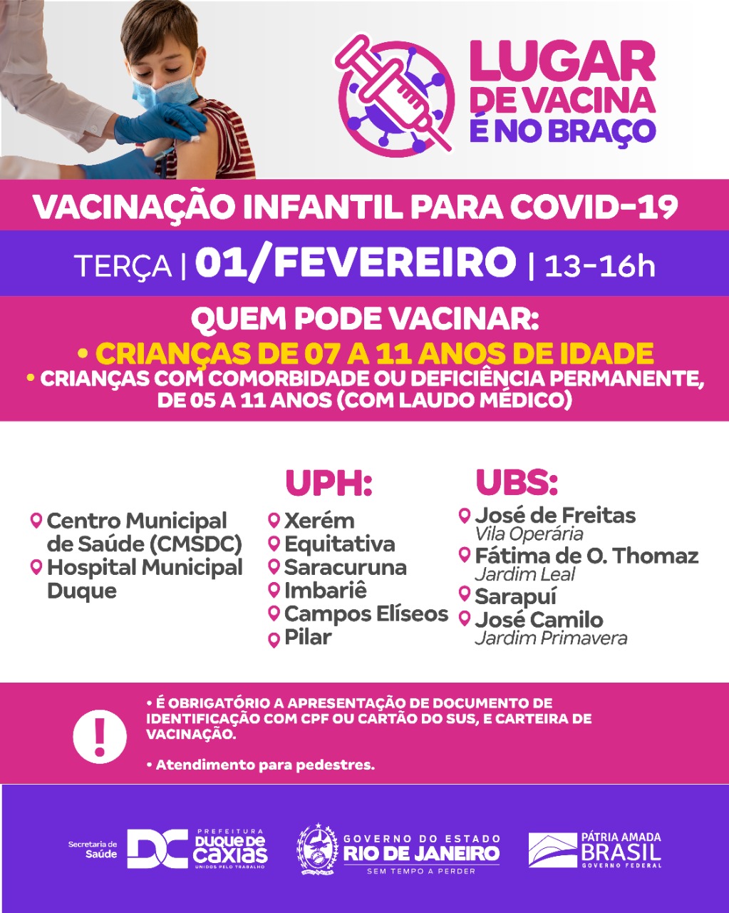 Duque de Caxias segue nesta terça-feira (01/02), com a campanha de vacinação infantil contra a Covid-19 para crianças com idade de 07 a 11 anos e para aquelas com comorbidades ou deficiência permanente (5 a 11 anos), mediante a apresentação de laudo médico. A Secretaria Municipal de Saúde alerta aos responsáveis sobre a obrigatoriedade de levar documento de identificação com CPF ou Cartão do SUS da criança.