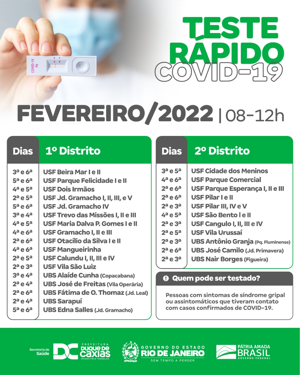 Nesta terça-feira (01/02), o teste rápido acontece, das 8h às 12h, nas seguintes unidades: