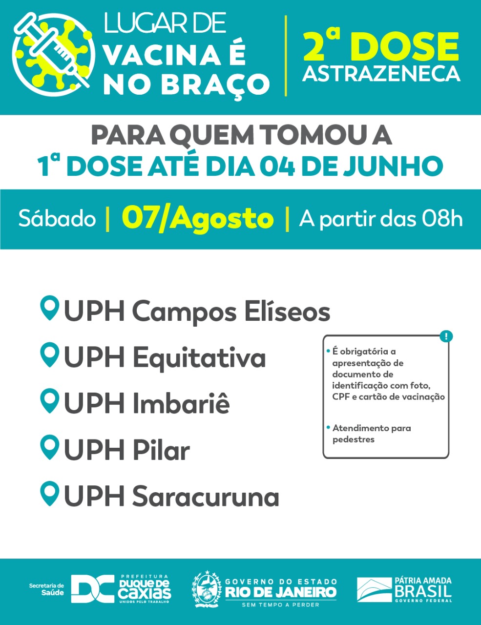 A Prefeitura de Duque de Caxias, através da Secretaria Municipal de Saúde, promove neste sábado (07/08), vacinação da segunda dose antecipada de Astrazeneca para quem recebeu a primeira dose em data anterior a 04/06. É obrigatória a apresentação do cartão de vacinação e documento de identificação com CPF.