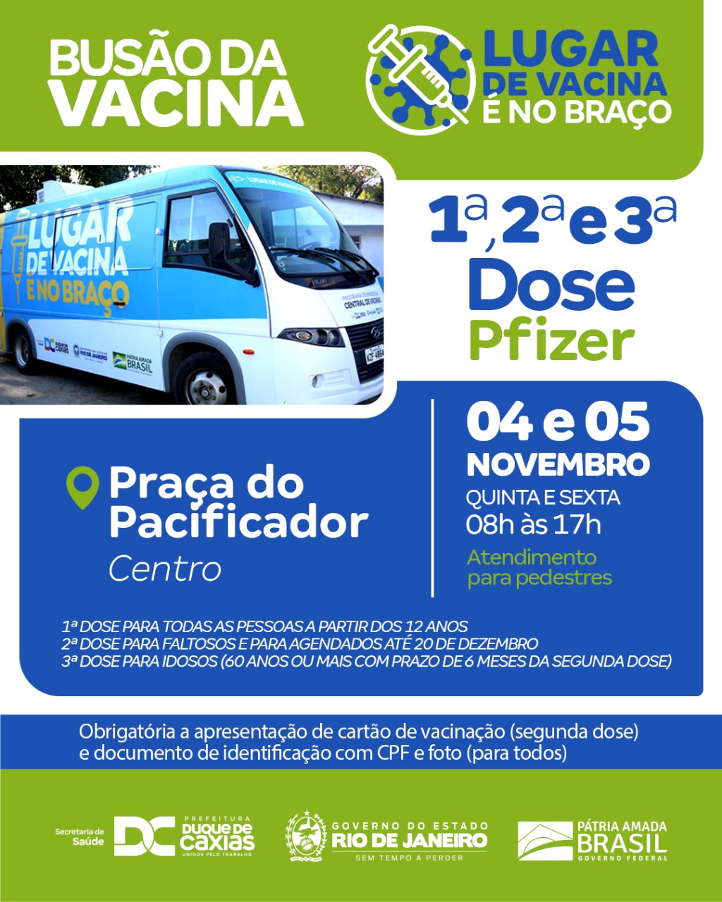 A Prefeitura de Duque de Caxias, através da Secretaria Municipal de Saúde, estará nesta quarta e quinta-feira (04 e 05/11), com o Busão da Vacina, das 8h às 17h, na Praça do Pacificador (Centro-DC), para a aplicação da primeira, segunda e terceira doses da vacina Pfizer. A vacinação com as três doses da Pfizer também acontece no CER IV (Sarapuí) e no CRAS da Figueira (Rod. Washington Luiz, s/n), das 8h às 15h, até a sexta-feira.