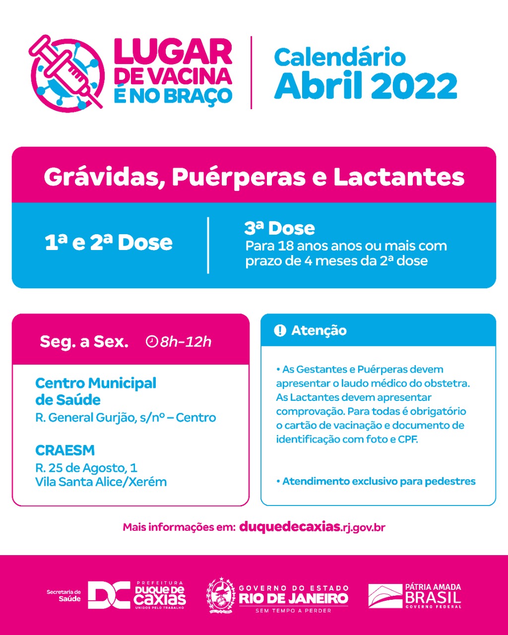 * Vacinação para Gestantes, Puérperas e Lactantes – Este grupo pode receber a primeira, segunda e terceira (para quem completou 4 meses da segunda dose) no Centro Municipal de Saúde (CMSDC) e no CRAESM de Xerém. As Gestantes e Puérperas devem apresentar o laudo médico do obstetra. As Lactantes devem apresentar comprovação. Nos três casos é obrigatória a apresentação de cartão de vacinação (segunda dose) e documento de identificação com CPF e foto.