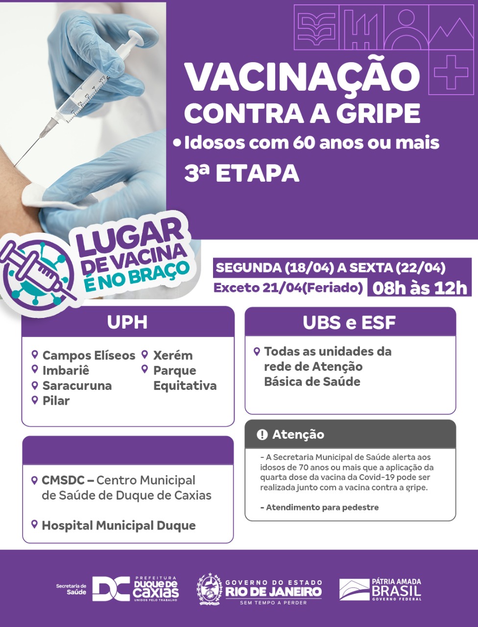 O município de Duque de Caxias fará vacinação contra a Covid-19, nesta sexta-feira (22), com a aplicação de todas as doses para crianças (05 a 11 anos), adolescentes, adultos (a partir de 12 anos) e com a segunda dose de reforço (quarta dose) para os idosos com 80 anos ou mais, que tenham completado quatro meses da aplicação da terceira dose. Os idosos de 60 anos ou mais também podem receber a vacina contra a Gripe Influenza. A Secretaria Municipal de Saúde alerta que não há contraindicação para que os idosos recebam a vacina da Covid-19 e da Gripe no mesmo dia. Para todas as vacinas é obrigatório a apresentação do cartão de vacinação e documento de identificação com CPF e foto.