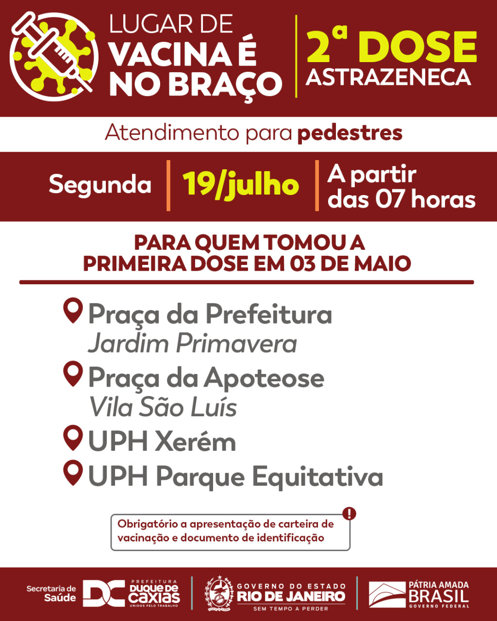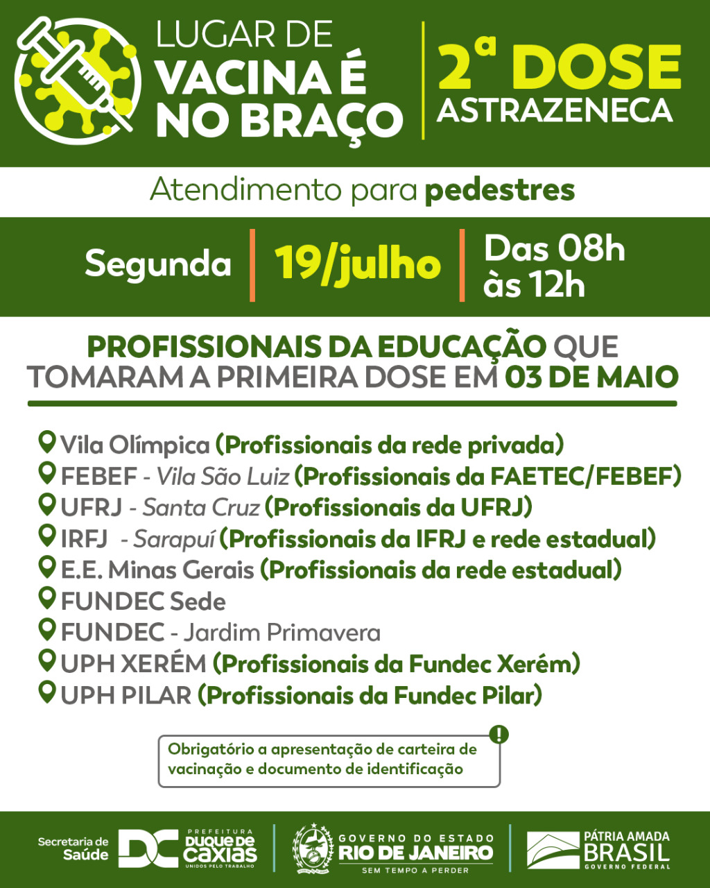 A Prefeitura de Duque de Caxias, através da Secretaria Municipal de Saúde, promove nesta segunda-feira (19/07), vacinação com a primeira dose para pessoas com 35 e 34 anos. É obrigatório a apresentação de comprovante de residência e documento de identificação.