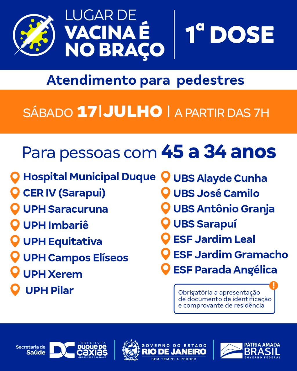 A Prefeitura de Duque de Caxias, através da Secretaria Municipal de Saúde, realiza neste sábado (17), mais um mutirão de vacinação de primeira dose para pessoas com idade entre 45 a 34 anos.