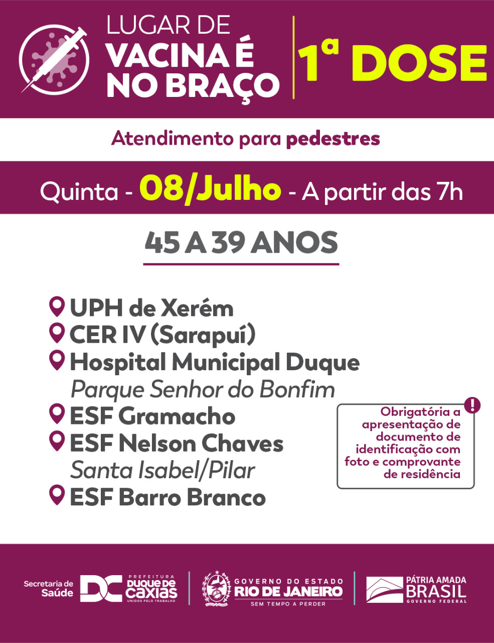 A Prefeitura de Duque Caxias, através da Secretaria Municipal de Saúde, segue nesta quinta-feira (08/07) com o calendário de vacinação de primeira dose contemplando todos com idade entre 45 a 39 anos. Para receber a primeira dose é obrigatório a apresentação de documento de identificação com foto e comprovante de residência.