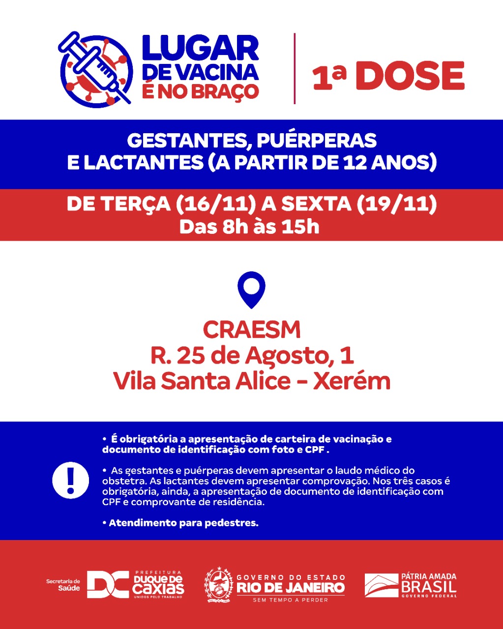 No CMSDC - Centro Municipal de Saúde (Av. General Gurjão – Centro), a vacinação segue de terça (16) a sexta-feira (19), para os seguintes grupos: primeira dose para gestantes, puérperas e lactantes (a partir de 12 anos). Este grupo também pode ser vacinado no CRAESM de Xerém; segunda dose para faltosos de todas as vacinas; e terceira dose (reforço) para pessoas imunossuprimidas e idosos (com 60 anos ou mais com prazo de seis meses da segunda dose). Verifique a lista das imunodeficiências que podem receber a dose de reforço da vacina contra a Covid-19, no site da Prefeitura: (www.duquedecaxias.rj.org.br).