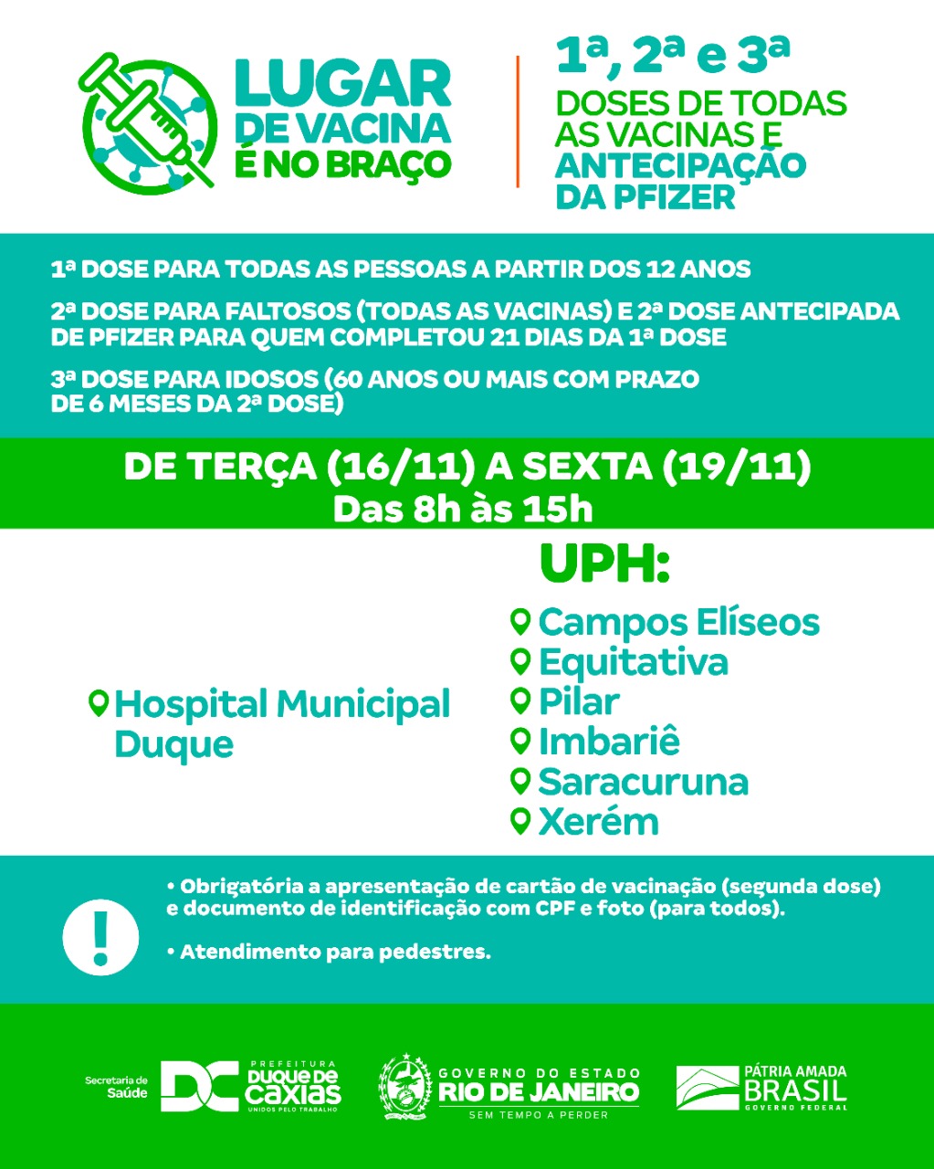 A terça-feira (16/11) em Duque de Caxias será com vacinação da segunda dose de Pfizer antecipada, para aqueles que estão completando 21 dias da primeira dose. A vacinação segue também em todo o município com a primeira dose (para pessoas acima de 12 anos), segunda dose (para os faltosos de todas as vacinas) e terceira dose para idosos (60 anos ou mais com prazo de 6 meses da segunda dose).