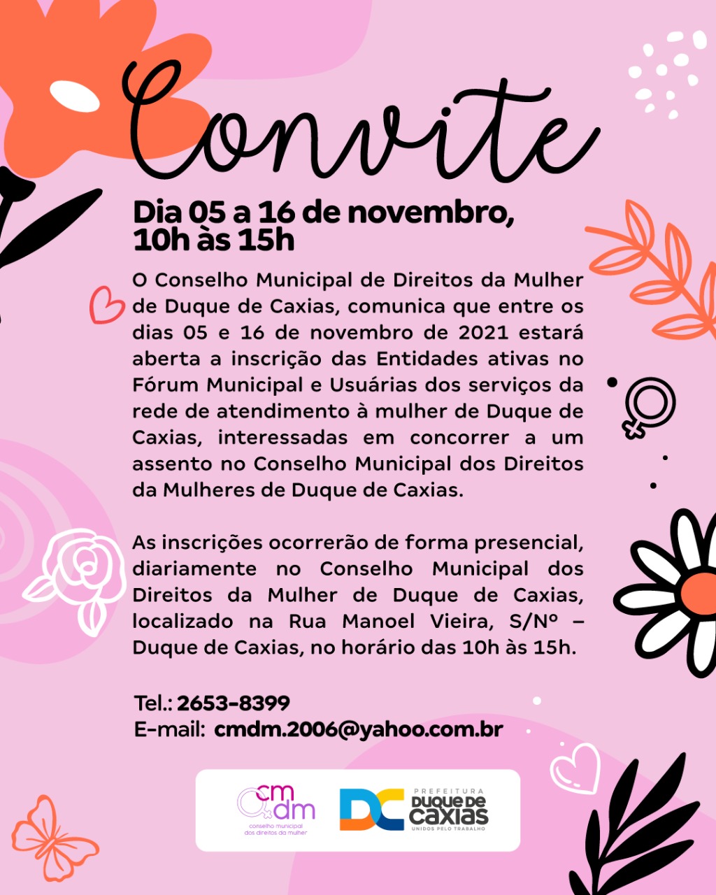 O Conselho Municipal dos Direitos da Mulher divulga o chamamento dos requisitos obrigatórios para cadastro das Entidades/Movimentos Sociais inscritos e ativos no Fórum Municipal dos Direitos da Mulher (FMDM) e, também, as usuárias dos serviços de atendimento do município para o cadastramento no Conselho, sendo requisito obrigatório para que as instituições concorram a uma cadeira.