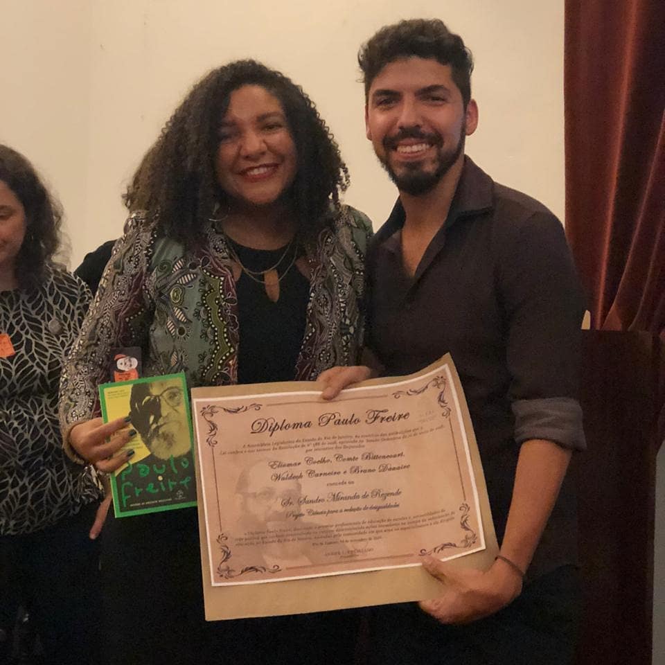 Dois professores do CIEP Municipalizado Ministro Santiago Dantas, localizado no bairro Itatiaia, em Duque de Caxias, receberam, no dia 14/11, na ALERJ (Assembleia Legislativa do Estado do Rio de Janeiro), o prêmio Paulo Freire. A condecoração teve o objetivo de reconhecer o trabalho dos profissionais da educação que se dedicam pela construção do conhecimento.