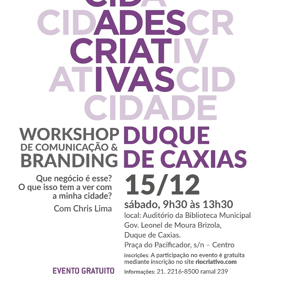 O Workshop "Comunicação e Branding" é uma ação do projeto Cidades Criativas RJ, idealizado pela Secretaria de Estado de Cultura do Rio de Janeiro e patrocinado pela Light, com o objetivo de dar visibilidade para as atividades culturais e turísticas de cidades do Estado.