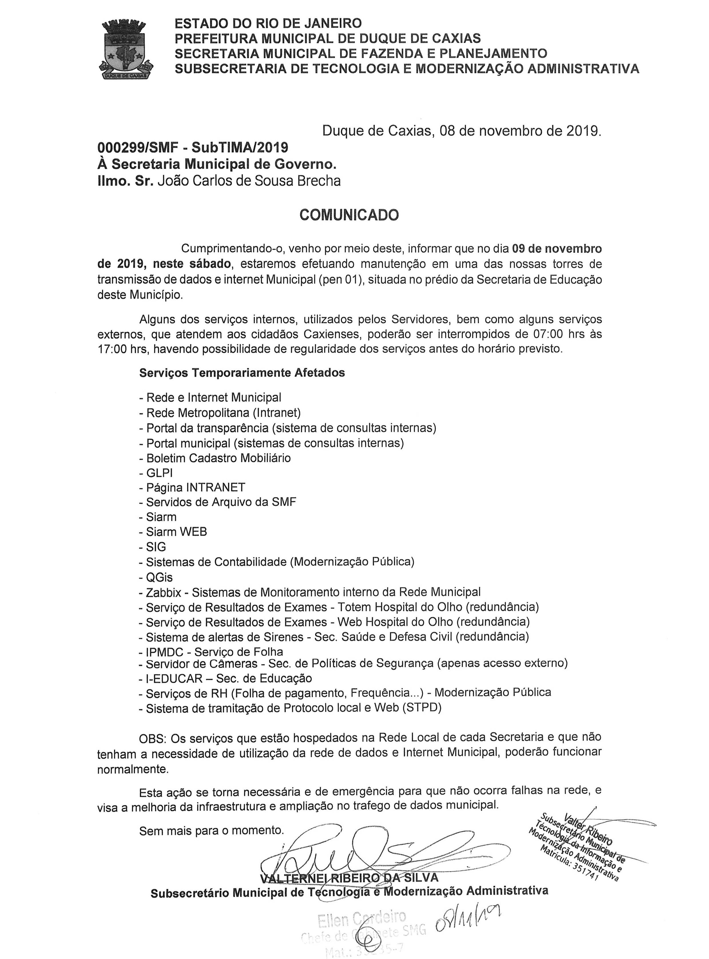 A Prefeitura de Duque de Caxias, através da Subsecretaria Municipal de Tecnologia e Modernização Administrativa, informa que no dia 09 de novembro de 2019 (sábado), será realizado serviço de manutenção em uma das torres de transmissão de dados e internet municipal (pen 01), situada no prédio da Secretaria de Educação de Duque de Caxias.