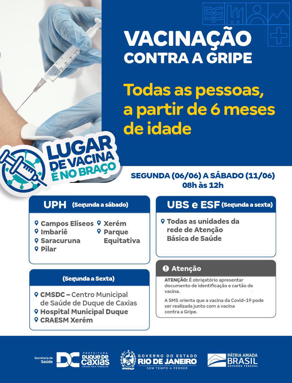 A Prefeitura de Duque de Caxias, através da Secretaria municipal de Saúde, segue a semana (06 a 11/06) com as campanhas de vacinação contra a Covid-19, Gripe e Sarampo no município.