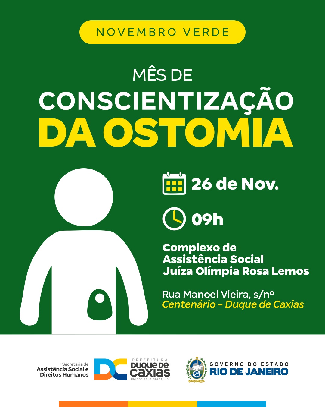 O Conselho Municipal de Defesa dos Direitos da Pessoa com Deficiência, através da Secretaria Municipal de Assistência Social e Direitos Humanos de Duque de Caxias, realizará, no dia 26 de novembro, às 9h, uma ação no Complexo de Assistência Social Juíza Olímpia Rosa Lemos. A iniciativa integra o Novembro Verde, mês dedicado à conscientização sobre a ostomia.