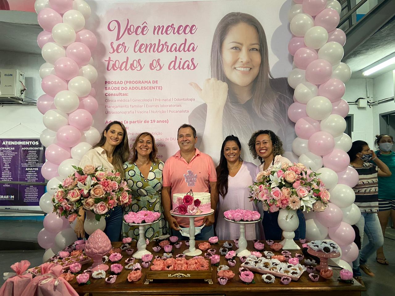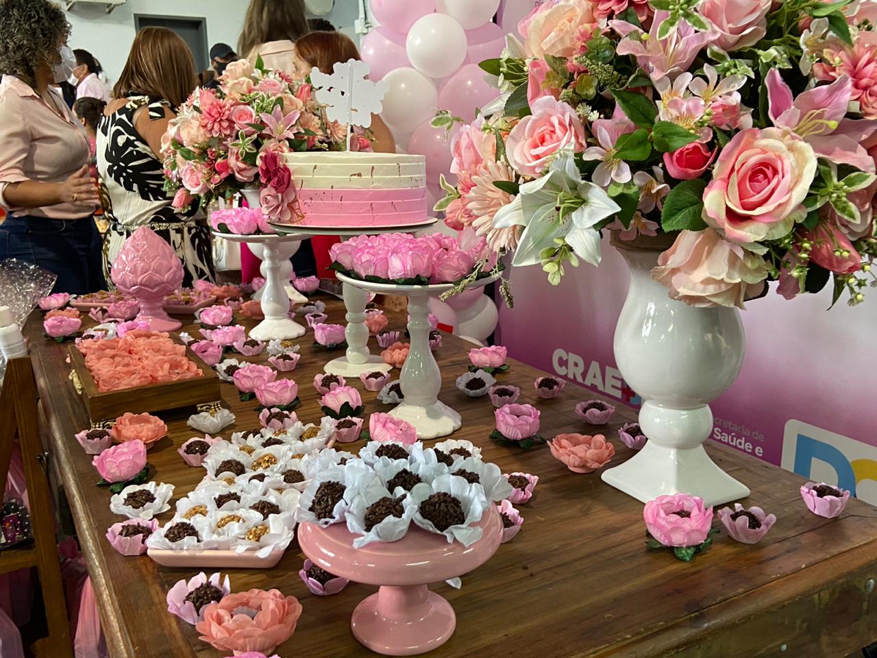 No CRAESM, as mulheres atendidas na unidade participaram de um café da manhã, com a presença do vice-prefeito Wilson Miguel, do vereador Júnior Reis, dos deputados Estadual Rosenverg Reis e Federal Gutemberg Reis, da diretora Dra Maria Francisca Cimineli, profissionais de saúde e funcionários da unidade.