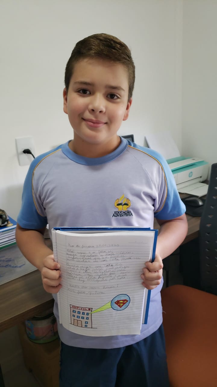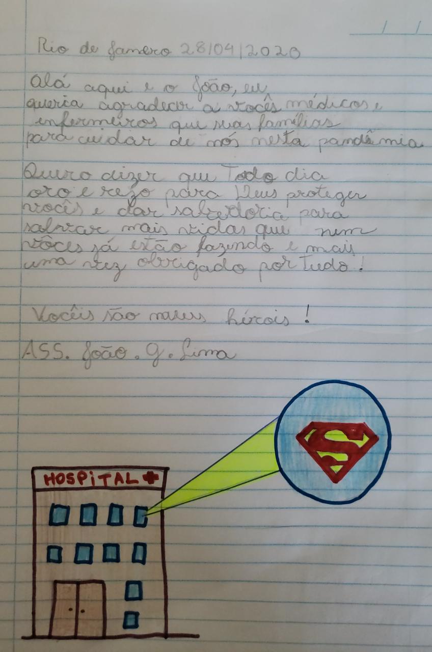 João Gabriel de Lima da Cruz tem 10 anos e é aluno do 5º ano. Segundo sua mãe, Vanessa Cristina de Lima, João sempre foi uma criança de bom coração e sempre gostou de fazer cartinhas de amor para todos em casa. “Quando soube do projeto, de imediato quis participar pois seria uma forma de mandar um recado do coração para os médicos que deixam suas famílias para cuidar das nossas famílias”, descreve Vanessa.