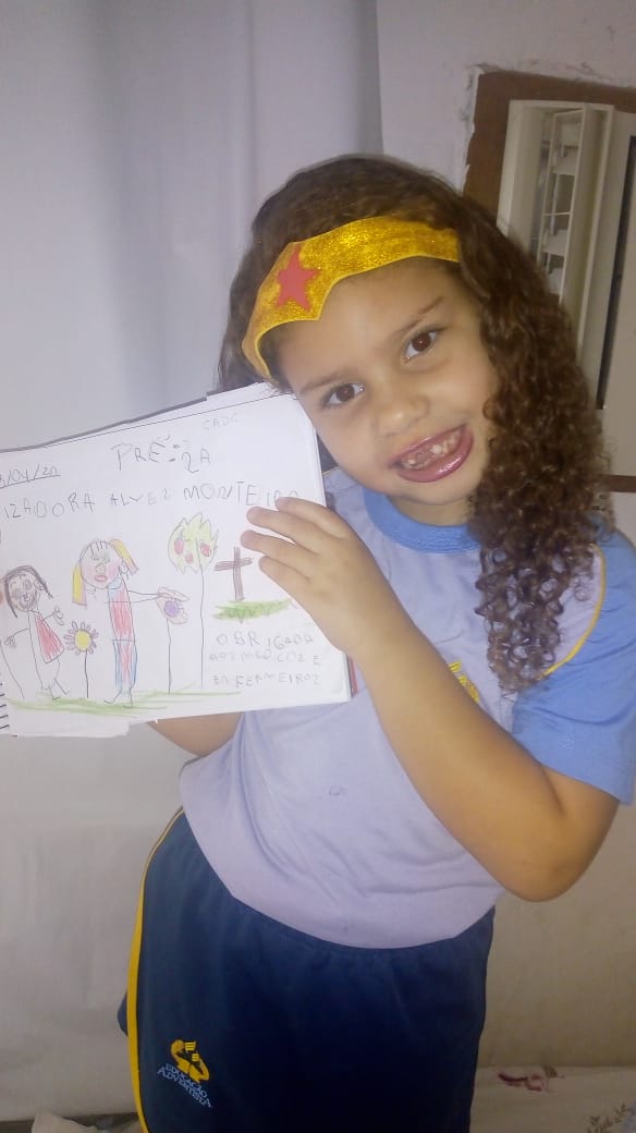 Izadora Alves Monteiro fez além da cartinha, um vídeo, falando do carinho pelos profissionais. “Muito obrigada pelos médicos. Eles estão cuidando de todo mundo e olha o desenho que fiz para vocês, tá aqui ó!”, fala Izadora, que faz o Pré II e tem apenas 5 anos.