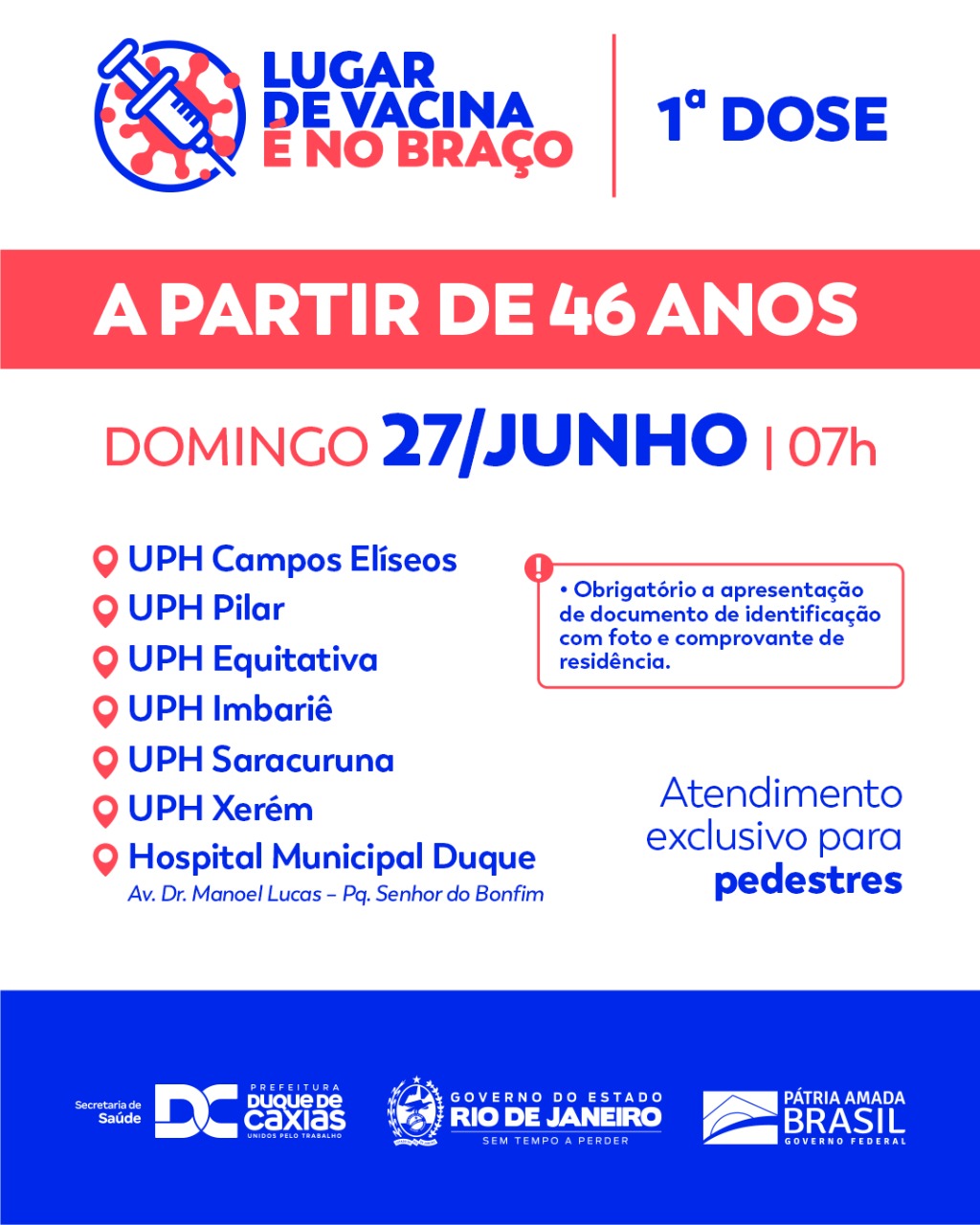 A Prefeitura de Duque de Caxias, através da Secretaria Municipal de Saúde, convoca pessoas de 46 anos ou mais para receber a primeira dose da vacina contra a Covid-19, neste domingo (27/06). Para receber a vacina é obrigatória a apresentação de documento de identificação e comprovante de residência.