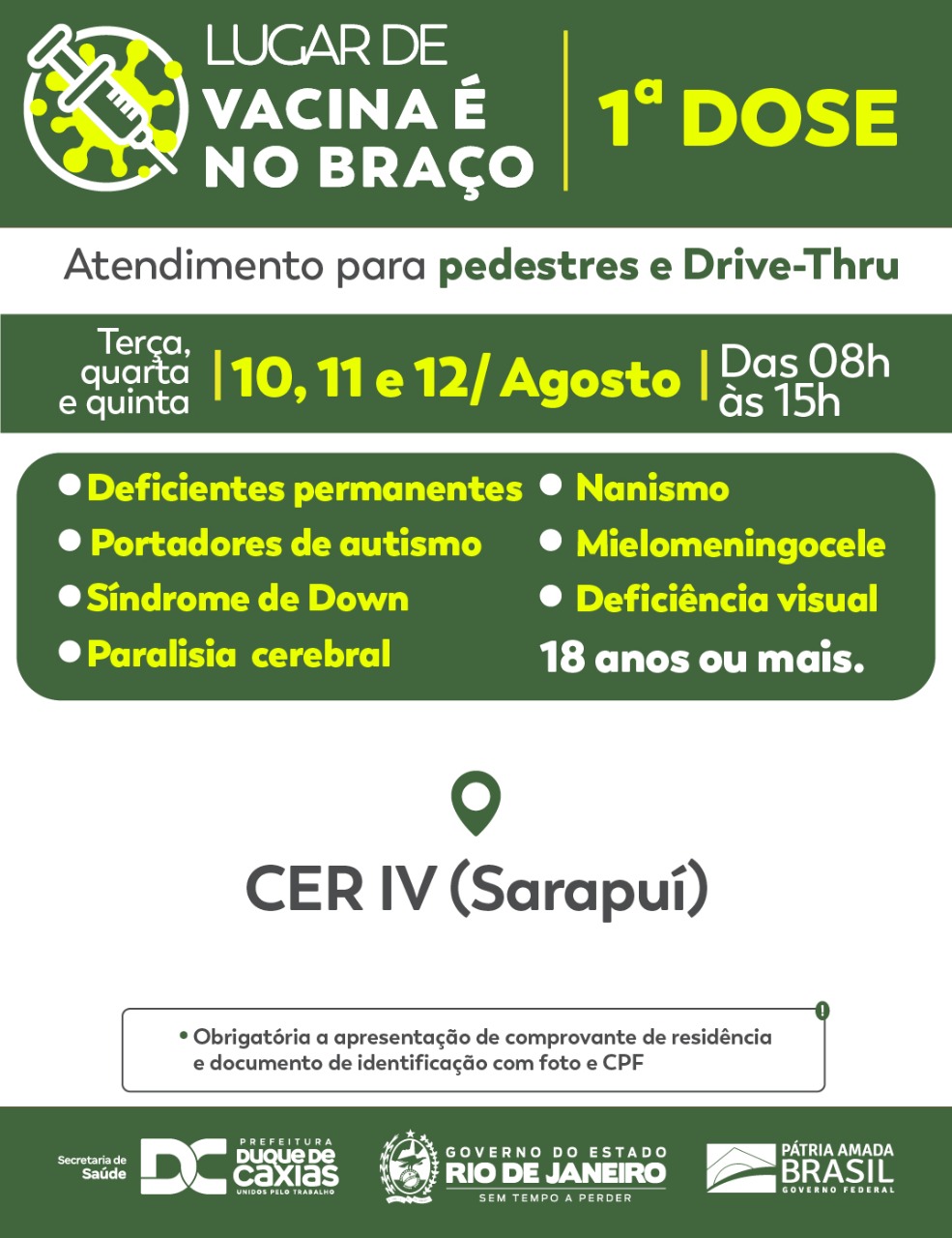 A primeira dose para esses grupos, acontece de terça-feira (10) a quinta-feira (12/08), das 8h às 15h, no CER IV, localizado na Av. República do Paraguai, Sarapuí. A vacinação acontece para pedestres e também no sistema Drive-Thru. É obrigatória a apresentação de comprovante de residência e documento de identificação com CPF.