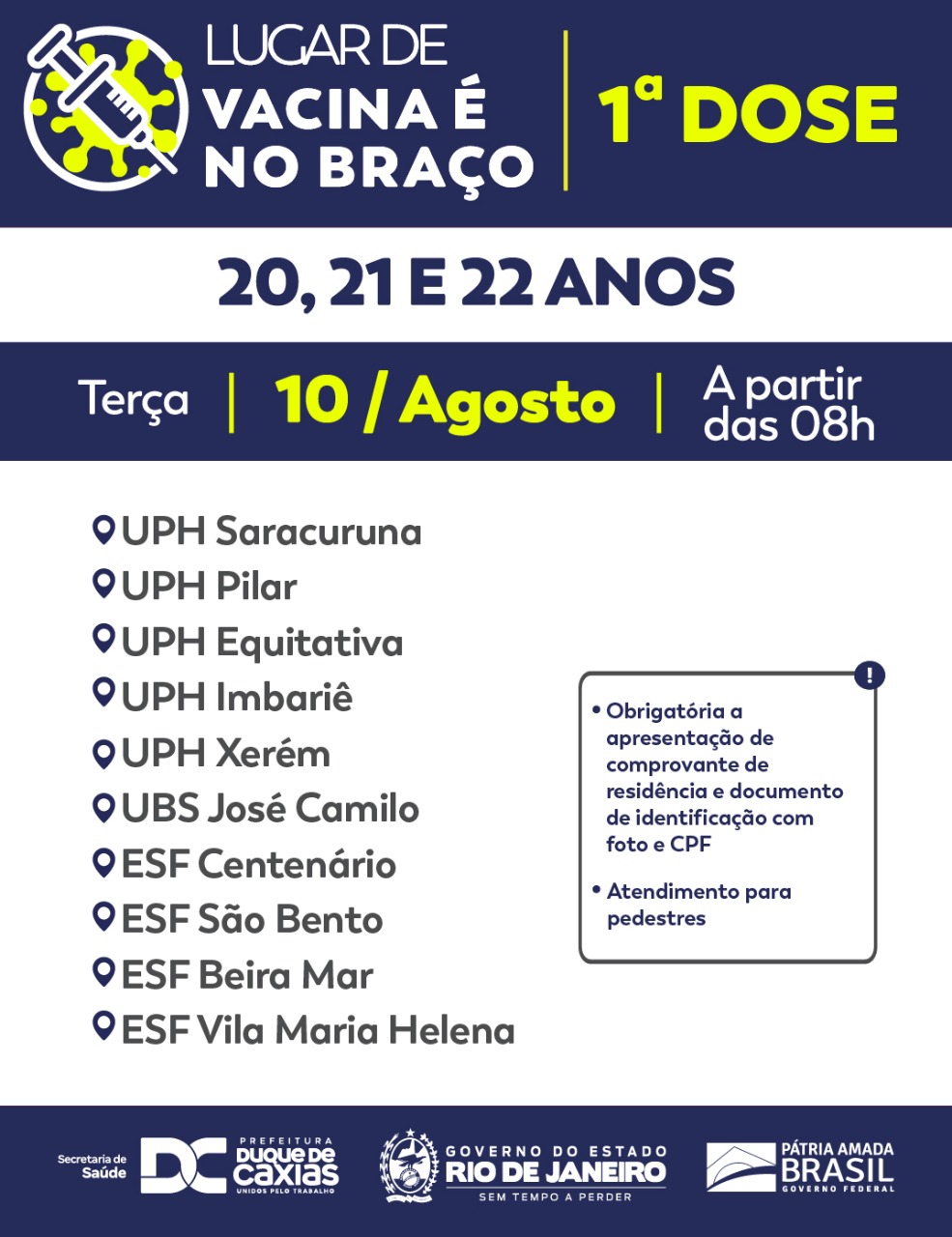 A Prefeitura de Duque de Caxias, através da Secretaria Municipal de Saúde, segue com a vacinação de primeira dose da vacina contra a Covid-19 para jovens de 20, 21 e 22 anos, nesta terça-feira (10/08), nos quatro distritos do município. Para receber a primeira dose é obrigatória a apresentação de comprovante de residência e documento de identificação com foto e CPF. A vacinação acontece, a partir das 8 horas, para pedestres, nos seguintes locais: