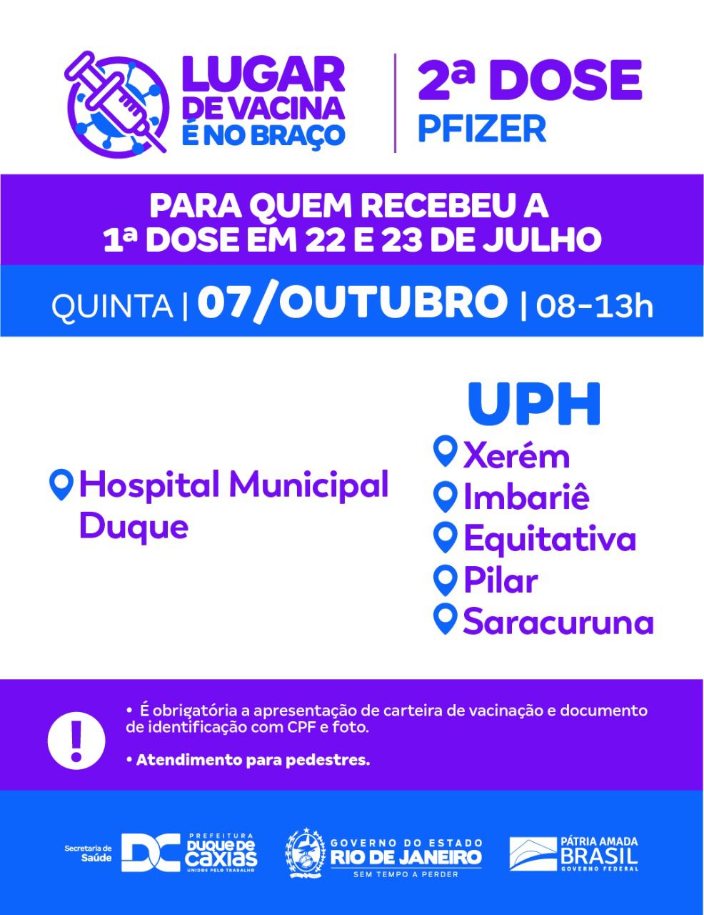 A Prefeitura de Duque de Caxias, através da Secretaria Municipal de Saúde, aplica, nesta quinta-feira (07), das 8h às 13h, a segunda dose da vacina da Pfizer nas pessoas que receberam a primeira dose do mesmo imunizante nos dias 22 e 23 de julho. A vacinação vai ocorrer nos seguintes locais: Hospital Municipal Duque, UPH Xerém, UPH Imbariê, UPH Equitativa, UPH Pilar, e UPH Saracuruna.