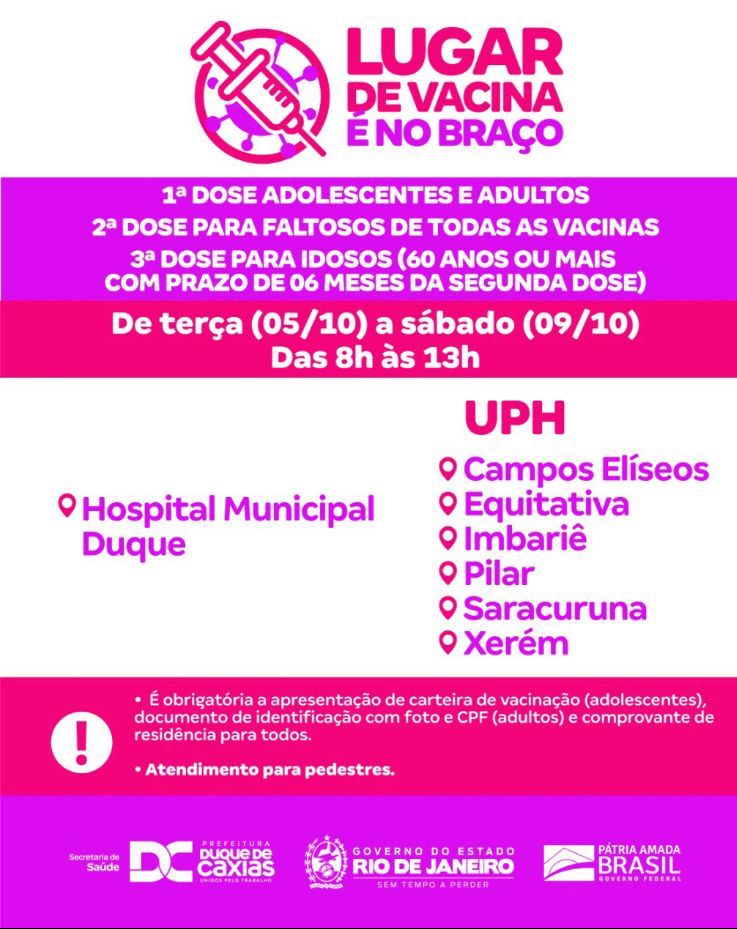 Além disso, até sábado (09), das 8h às 13h, haverá vacinação da primeira dose para adolescentes e adultos; a segunda dose de todas as vacinas; e a terceira dose (reforço) para os idosos, a partir de 60 anos, que tenham completado seis meses da aplicação da segunda dose, nos seguintes locais: UPH de Campos Elíseos, Equitativa, Imbariê, Pilar, Saracuruna, Xerém e no Hospital Duque.