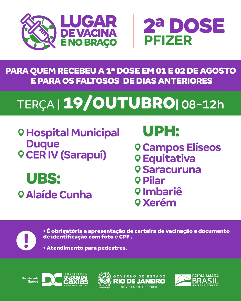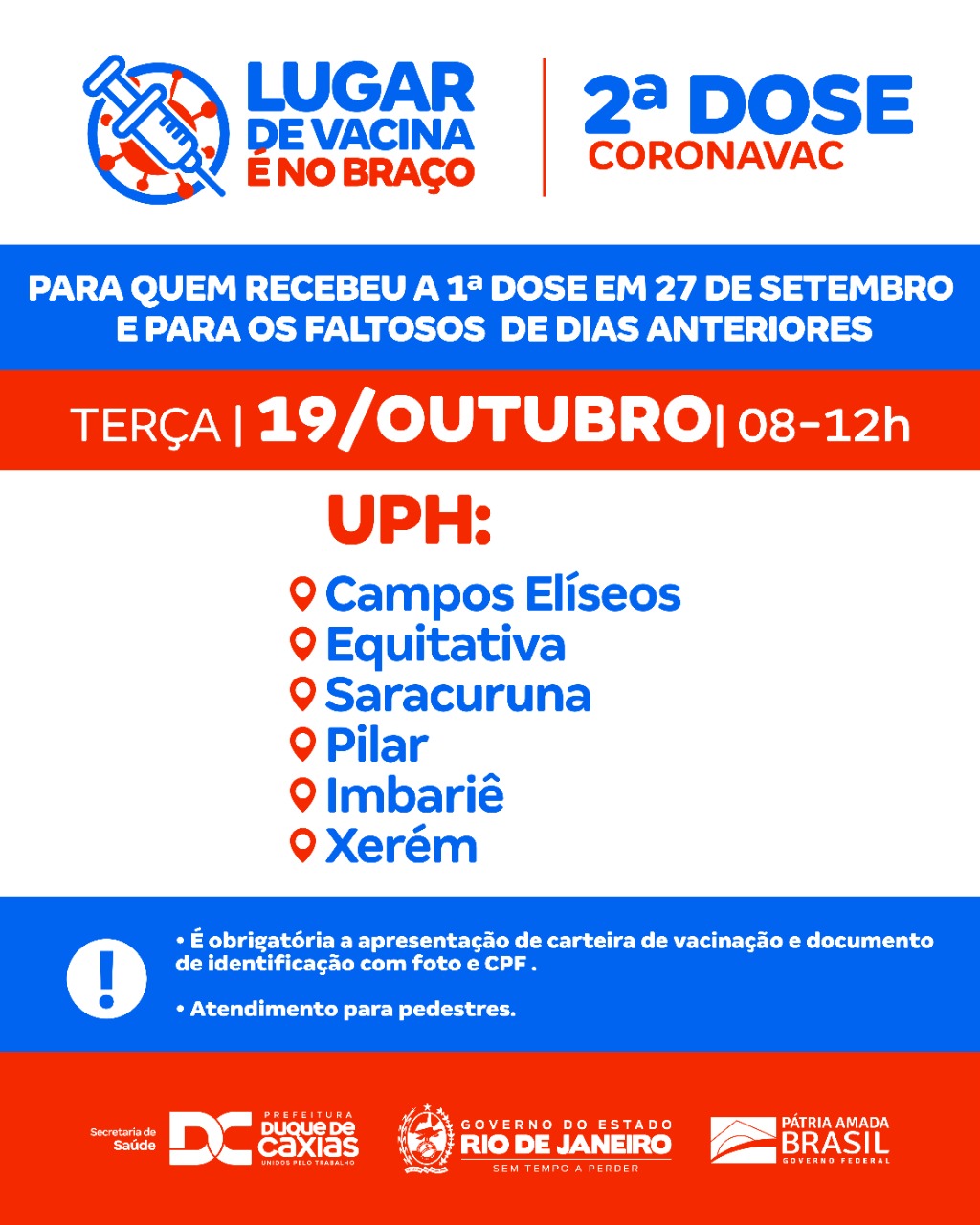 A Prefeitura de Duque de Caxias, através da Secretaria Municipal de Saúde, aplica, nesta terça-feira (19/10), das 8h às 12h, a segunda dose das vacinas Coronavac e Pfizer. A Coronavac será aplicada nas pessoas que tomaram a primeira dose do mesmo imunizante no dia 27 de setembro ou para os faltosos dos dias anteriores. A vacinação vai ocorrer nos seguintes locais: UPH Campos Elíseos, UPH Xerém, UPH Imbariê, UPH Equitativa, UPH Pilar, e UPH Saracuruna.