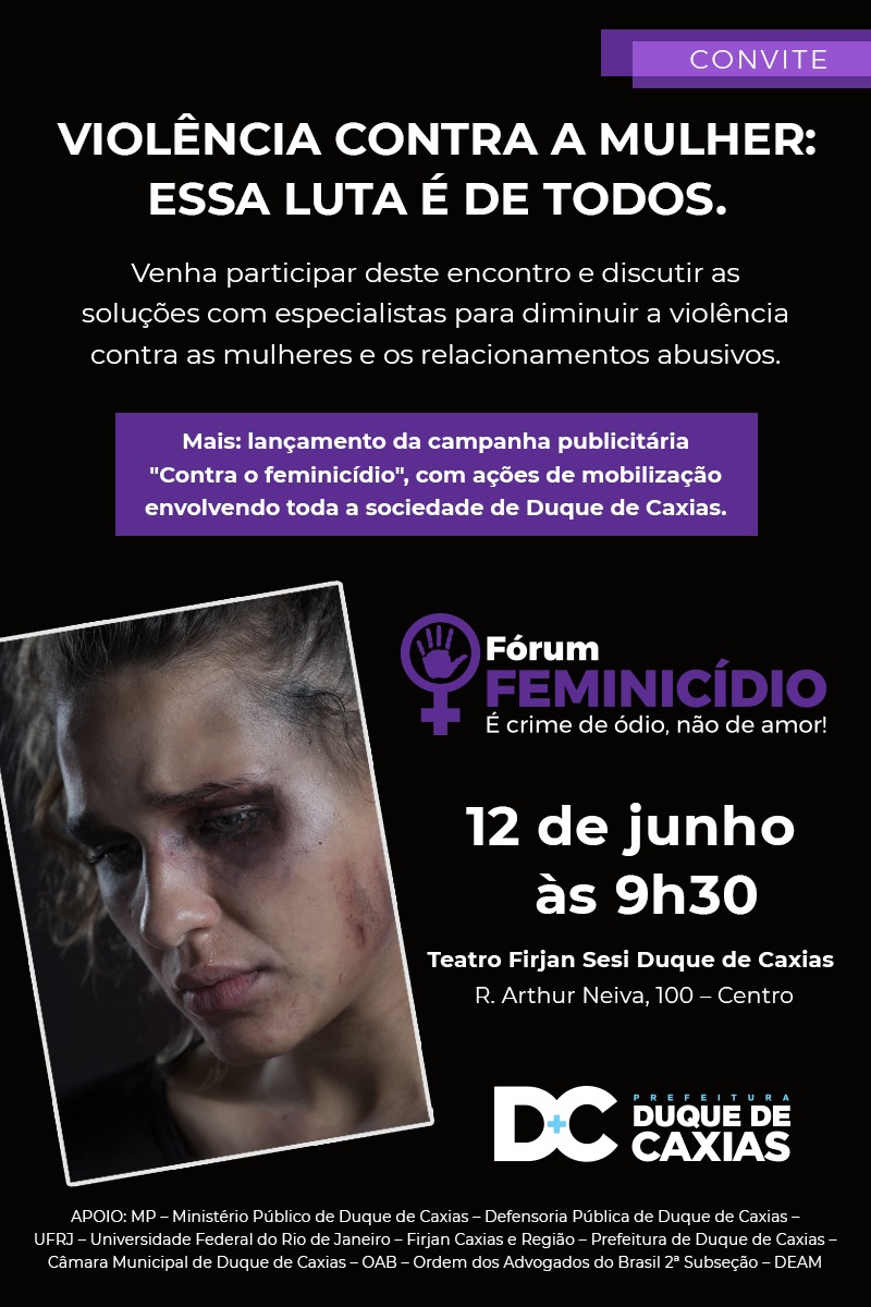 A Prefeitura de Duque de Caxias, com o apoio de diversos setores da sociedade civil, lança no próximo dia 12 de junho, uma enorme campanha de enfrentamento à violência contra a mulher. A campanha será lançada no Teatro Sesi, no Centro de Caxias. A iniciativa tem como objetivo diminuir os índices de feminicídio na cidade, que detém o recorde negativo de violência contra a mulher no estado. Em 2018, foram registrados mais de 3,8 mil casos no município, segundo dados do Instituto de Segurança Pública (ISP).