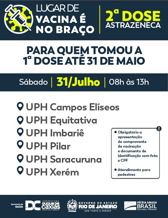 A Prefeitura de Duque de Caxias promove neste sábado (31/07) vacinação com aplicação da segunda dose antecipada da Astrazeneca, para quem recebeu a primeira dose em data anterior a 31 de maio. A Secretaria Municipal de Saúde destaca que é obrigatória a apresentação do cartão de vacinação e documento de identificação com CPF.