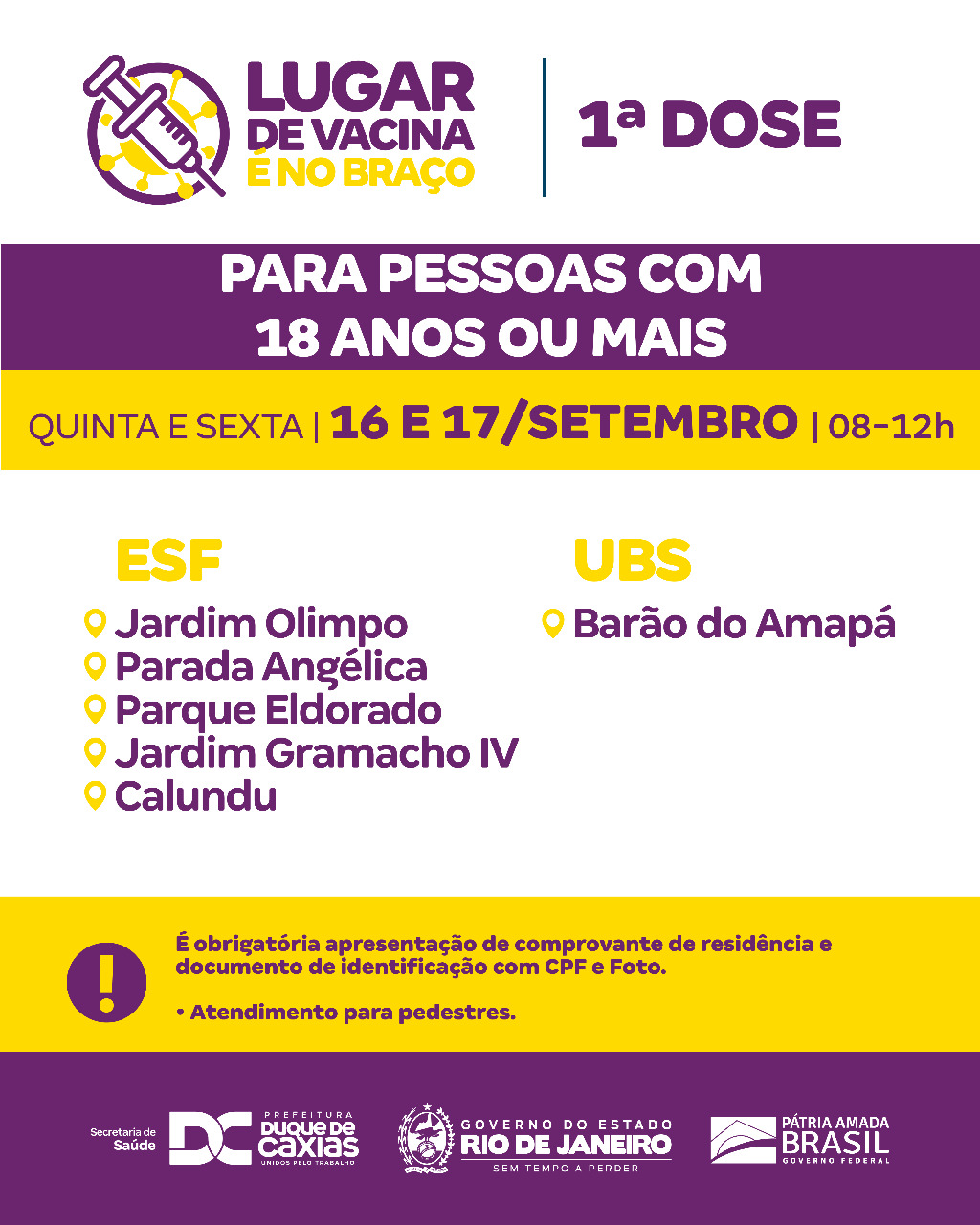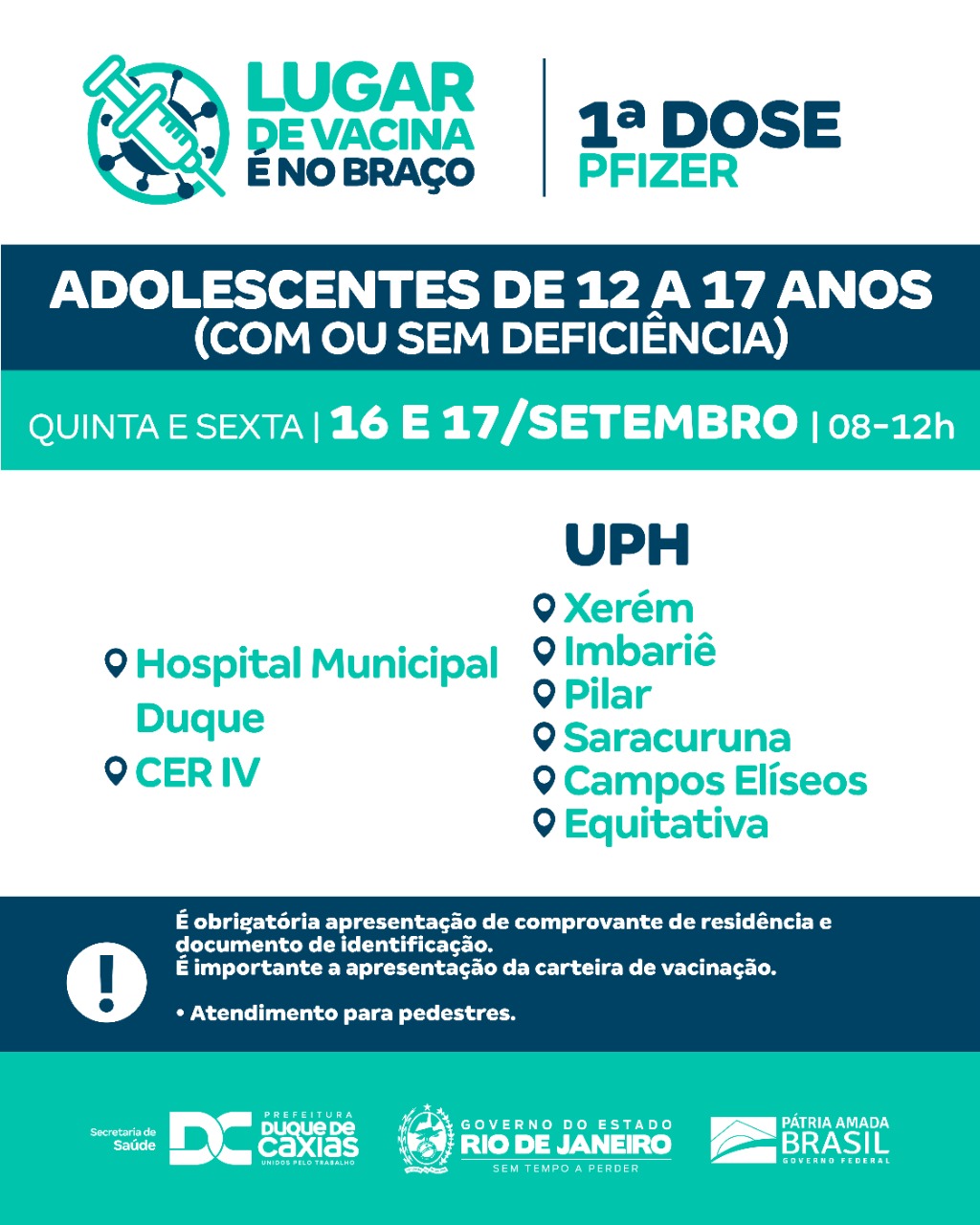Nesta quinta-feira (16/09), a Prefeitura de Duque de Caxias promove vacinação com a primeira dose para os grupos formados por adolescentes de 12 a 17 anos (com ou sem deficiência) e para os adultos, a partir dos 18 anos de idade.