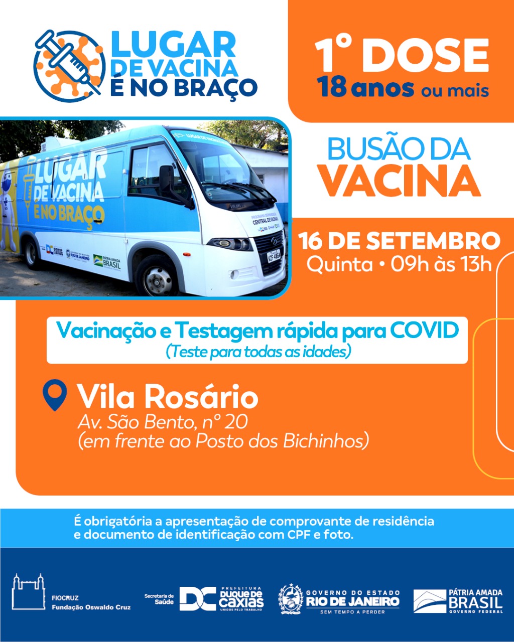A Secretaria Municipal de Saúde, em parceria com a Fiocruz – Fundação Instituto Osvaldo Cruz, promove uma ação de saúde com testagem e vacinação contra a Covid-19, voltada prioritariamente para os moradores da Vila Rosário, no segundo distrito. A atividade contará com a presença do ‘Busão da Vacina’, a unidade móvel da SMSDC, disponibilizando a vacinação contra a Covid-19 para pessoas com idade a partir de 18 anos.