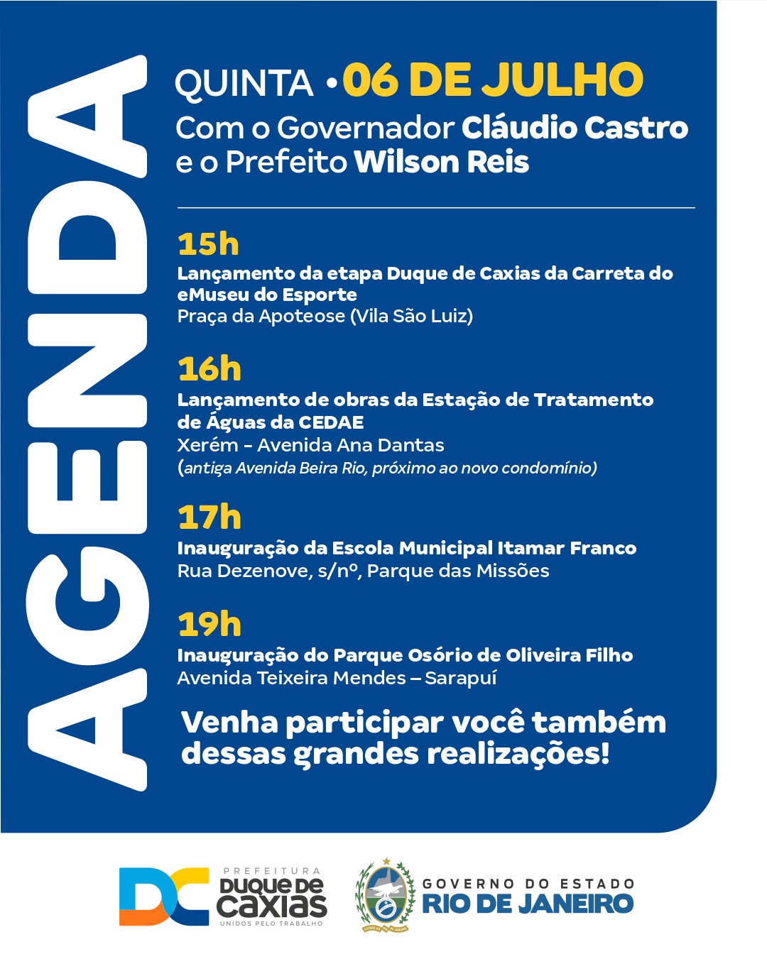 DUQUE DE CAXIAS RECEBE O GOVERNADOR CLÁUDIO CASTRO, NESTA QUINTA-FEIRA (06), PARA INAUGURAÇÕES E LANÇAMENTOS DE OBRAS