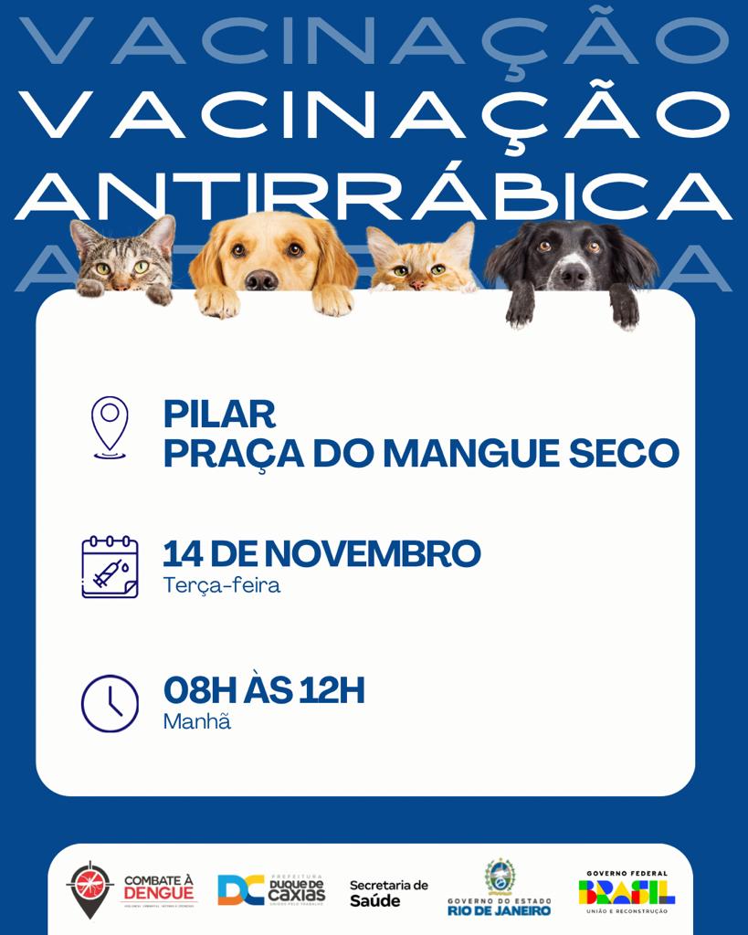 Dando continuidade à campanha de Vacinação Antirrábica para cães e gatos, a Secretaria Municipal de Saúde de Duque de Caxias, através da Superintendência de Vigilância Ambiental, Vetores e Zoonoses (SVAVZ), estará nos bairros Pilar e Saracuruna, nesta terça-feira (14/11). O atendimento acontecerá no período das 08h às 12h.