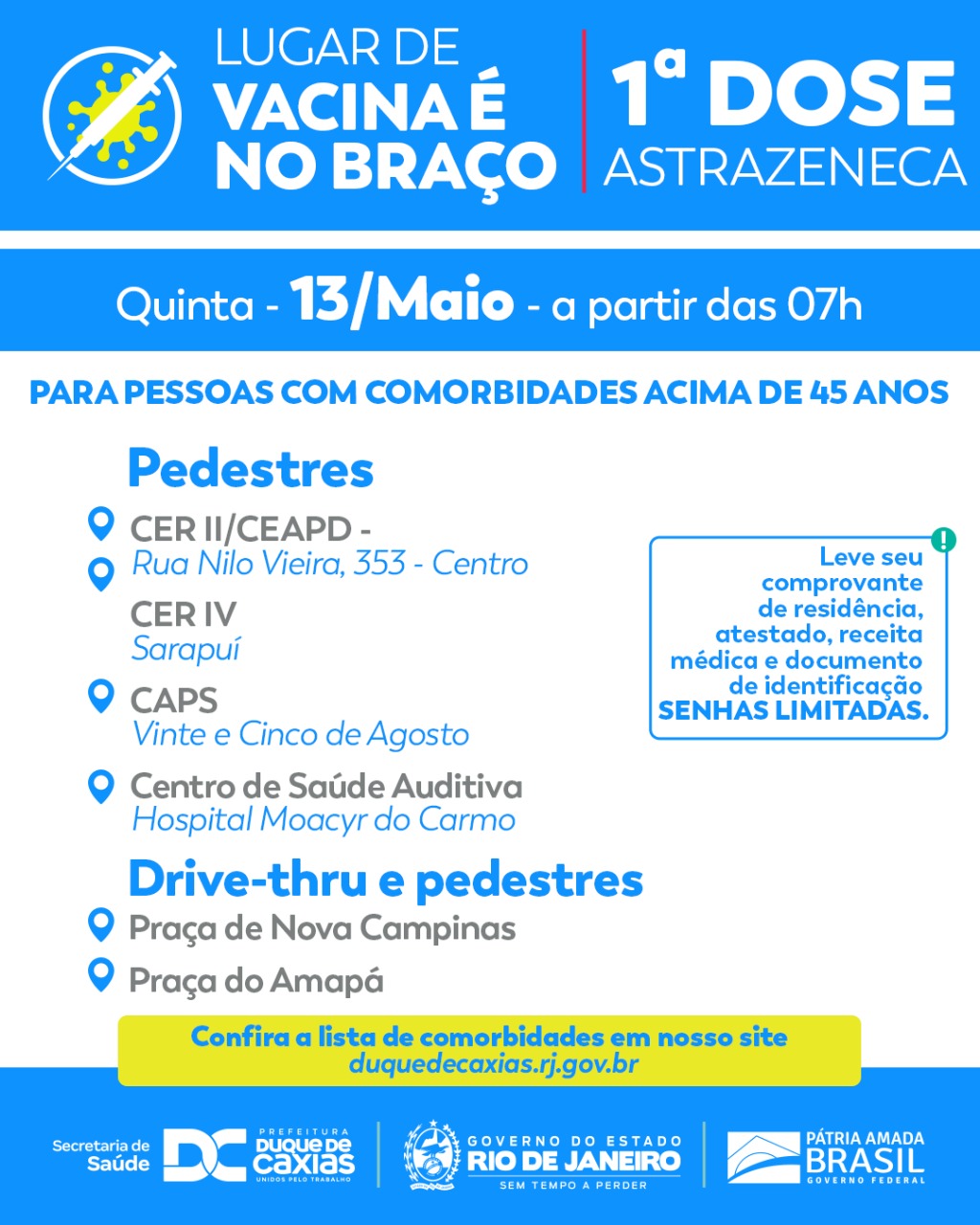 A Prefeitura de Duque de Caxias segue nesta quinta-feira (13/05) com a Vacinação de primeira dose de Astrazeneca para pessoas com comorbidades acima de 45 anos e com a aplicação da segunda dose de Coronavac para as pessoas que receberam a primeira dose em 27/03 ou data anterior.