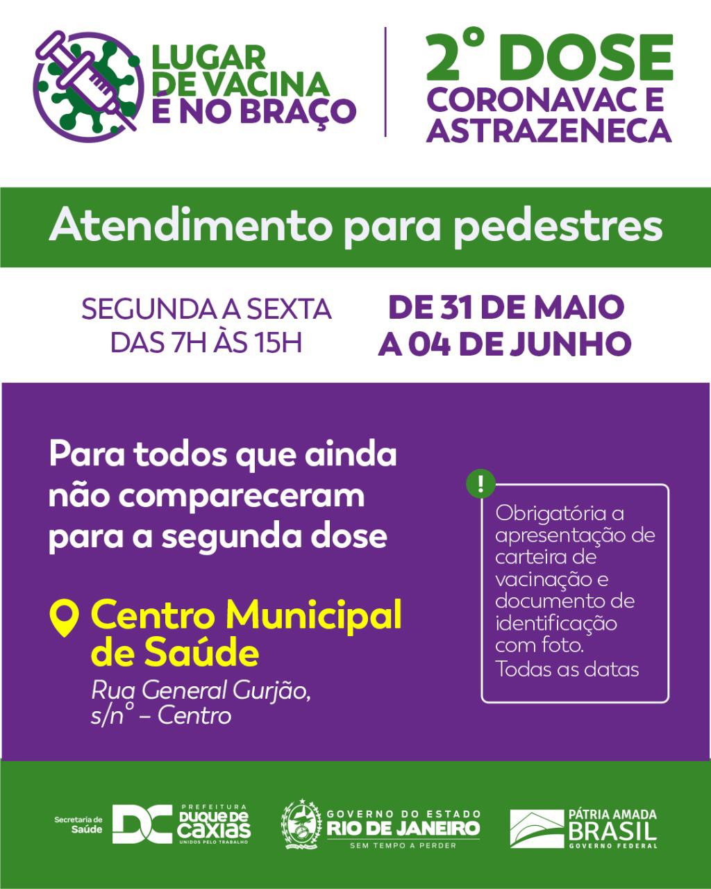 * Segunda Dose (Astrazeneca) – para todos que tomaram a primeira dose da Astrazeneca e que faltaram as convocações anteriores. É obrigatória a apresentação de carteira de vacinação e documento de identificação com foto.