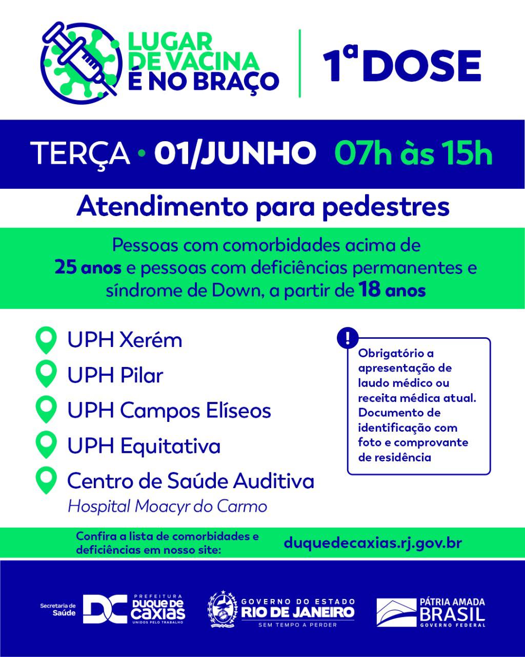 A vacinação acontece para pedestres, em cinco pontos de vacinação: UPH de Xerém, UPH Pilar, UPH Campos Elíseos, UPH Equitativa e Centro de Saúde Auditiva (Hospital Municipal Dr Moacyr Rodrigues do Carmo). É obrigatória a apresentação de atestado ou receita médica, documento de identificação e comprovante de residência. Confira a lista de comorbidades e deficiências permanentes no final do texto.
