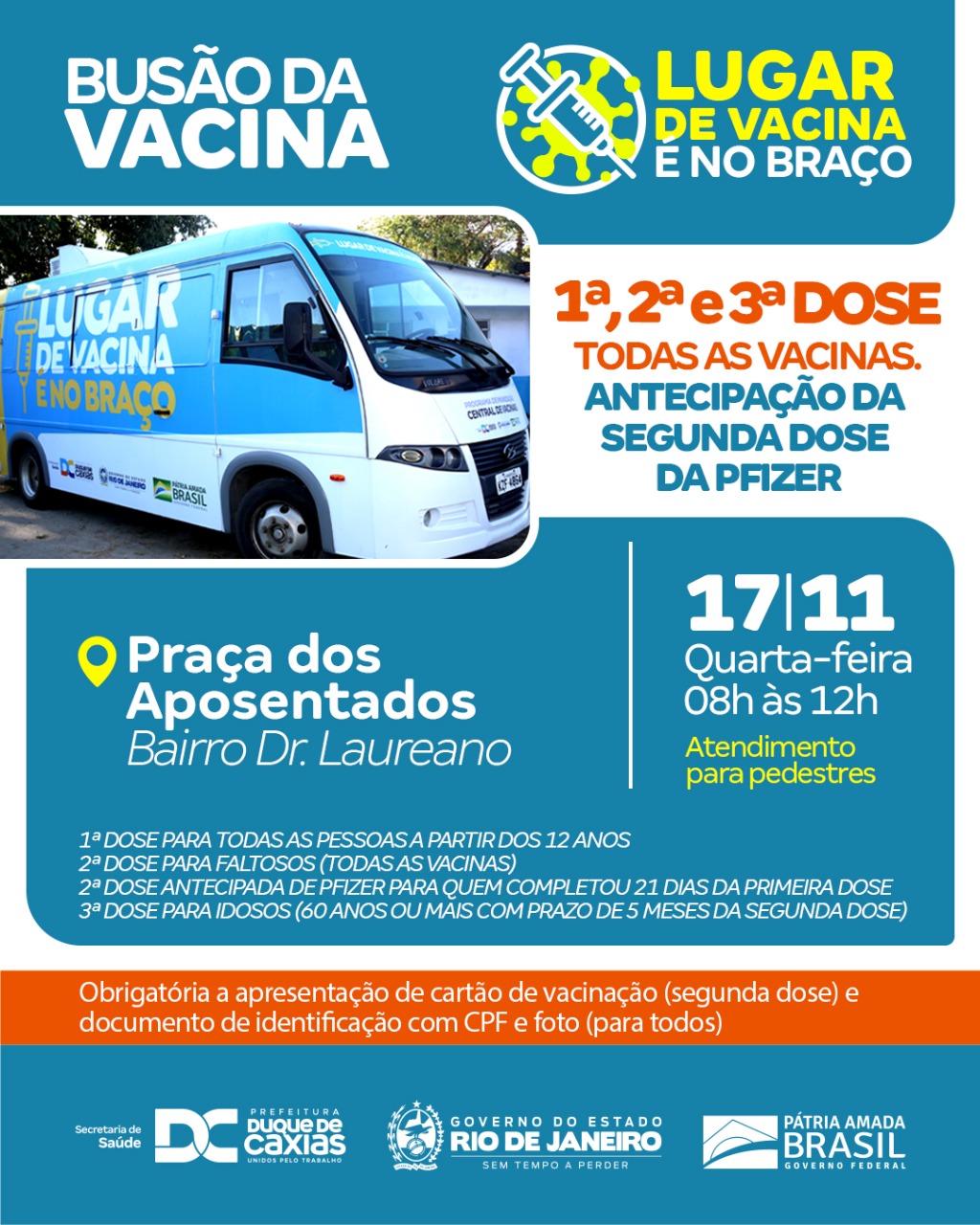 A Prefeitura de Duque de Caxias, através da Secretaria Municipal de Saúde, promove nesta quarta-feira (17/11), vacinação com a segunda dose de Pfizer antecipada, para aqueles que estão completando 21 dias da primeira dose. A vacinação segue também em todo o município com a primeira dose (para pessoas acima de 12 anos), segunda dose (para os faltosos de todas as vacinas) e terceira dose para idosos (60 anos ou mais com prazo de 5 meses da segunda dose).