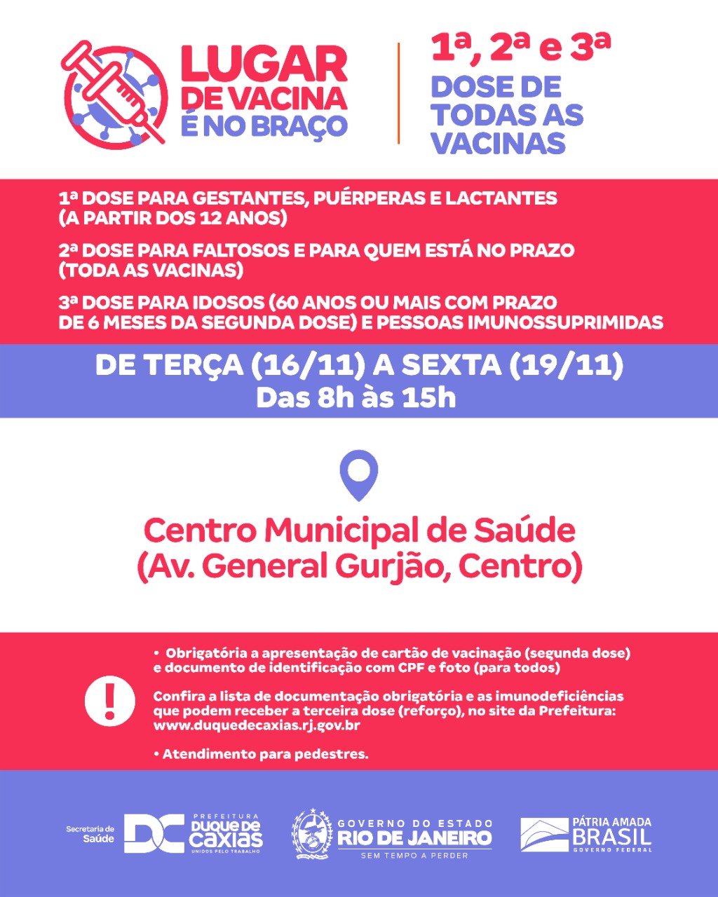 No CMSDC - Centro Municipal de Saúde (Av. General Gurjão – Centro), a vacinação segue até a sexta-feira (19), para os seguintes grupos: primeira dose para gestantes, puérperas e lactantes (a partir de 12 anos). Este grupo também pode ser vacinado no CRAESM de Xerém; segunda dose para faltosos de todas as vacinas; e terceira dose (reforço) para pessoas imunossuprimidas e idosos (com 60 anos ou mais com prazo de 5 meses da segunda dose). Verifique a lista das imunodeficiências que podem receber a dose de reforço da vacina contra a Covid-19, no site da Prefeitura: (www.duquedecaxias.rj.org.br).