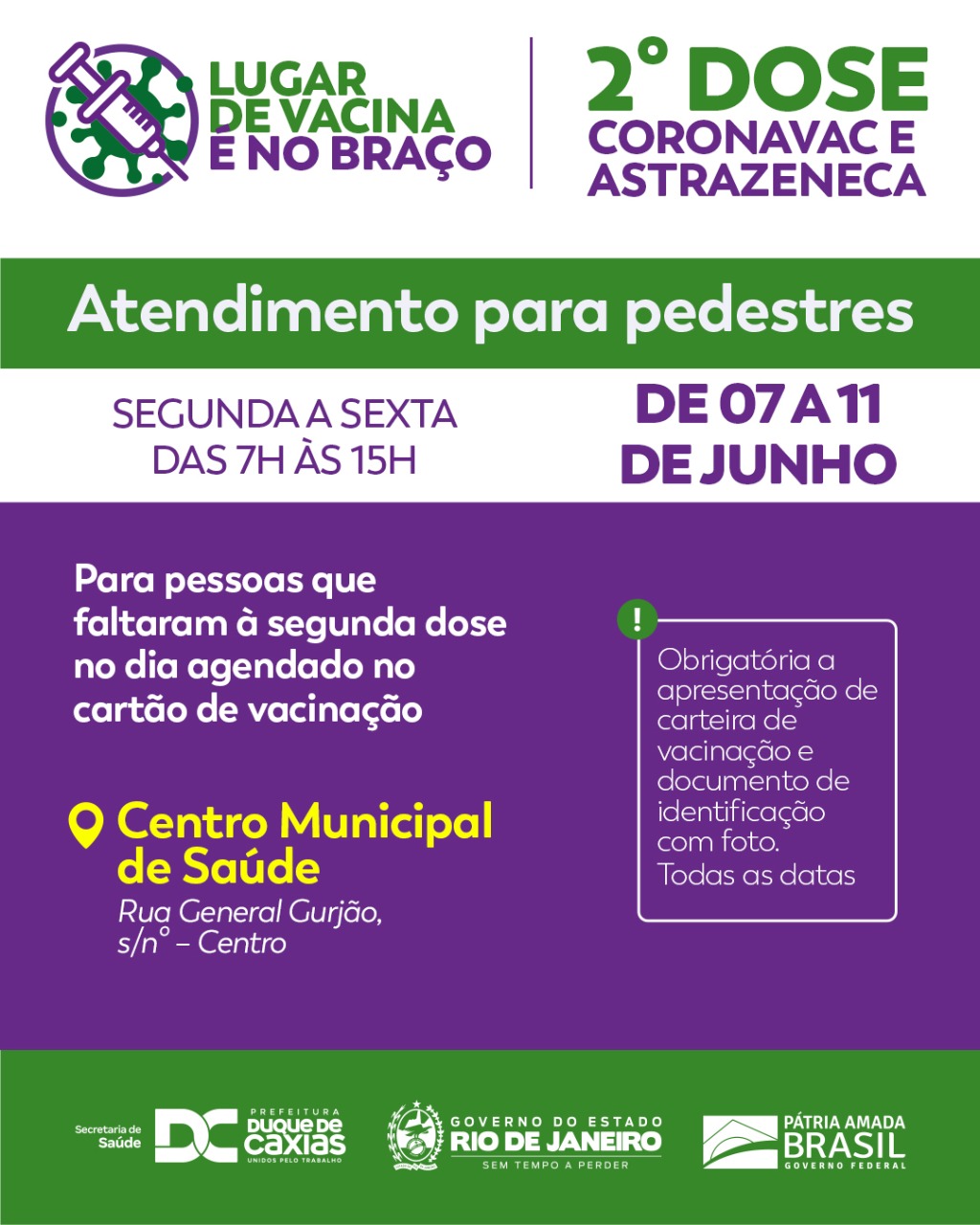 A segunda dose de Coronavac acontece, de 07 a 11/06, das 7h às 15h, no Centro Municipal de Saúde – CMSDC (Av. General Gurjão, Centro).