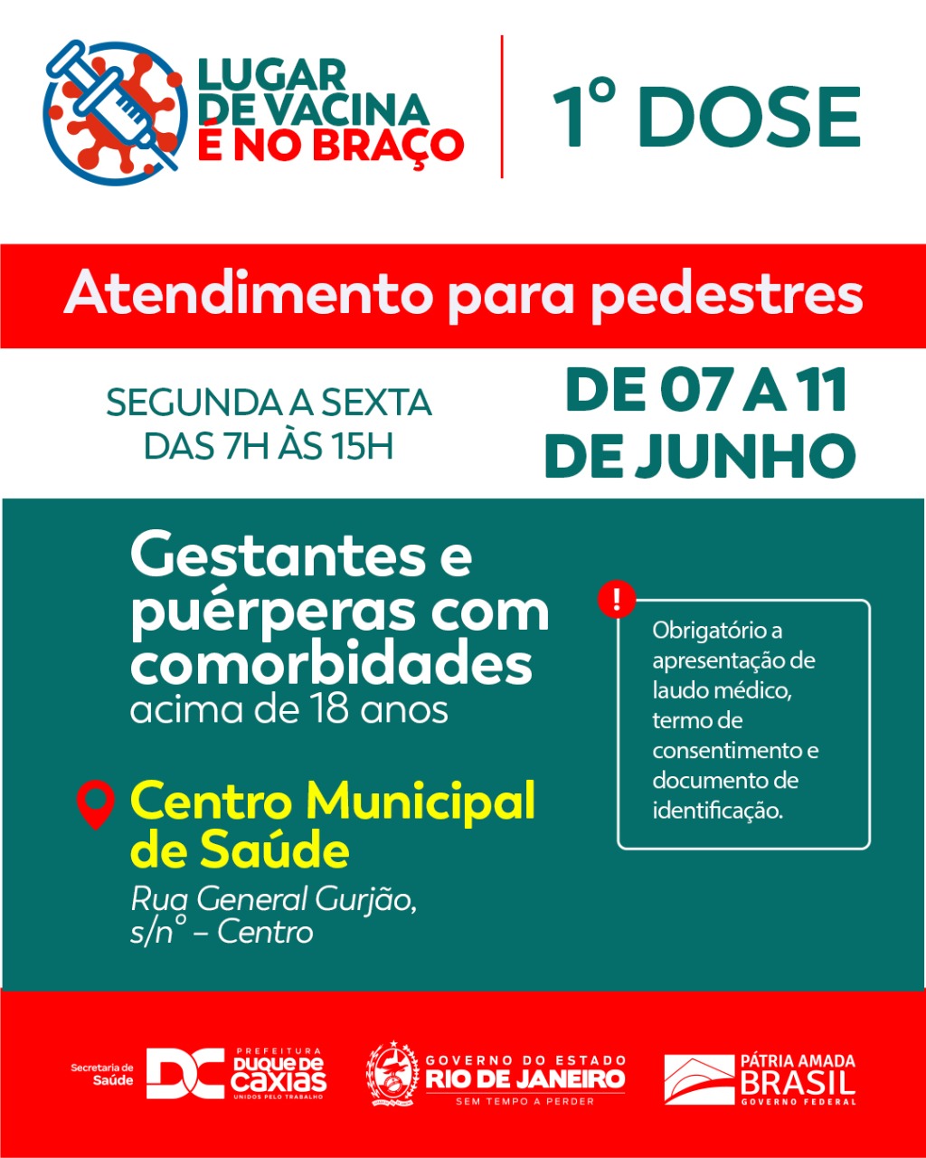 Gestantes e Puérperas com comorbidades – De 07 a 11 de junho, a Prefeitura segue também com a primeira dose da Coronavac, no Centro Municipal de Saúde (Av. General Gurjão – Centro), das 7h às 15h, para gestantes e puérperas com comorbidades (acima de 18 anos). É obrigatória a apresentação de laudo médico e termo de consentimento, documento de identificação e comprovante de residência.