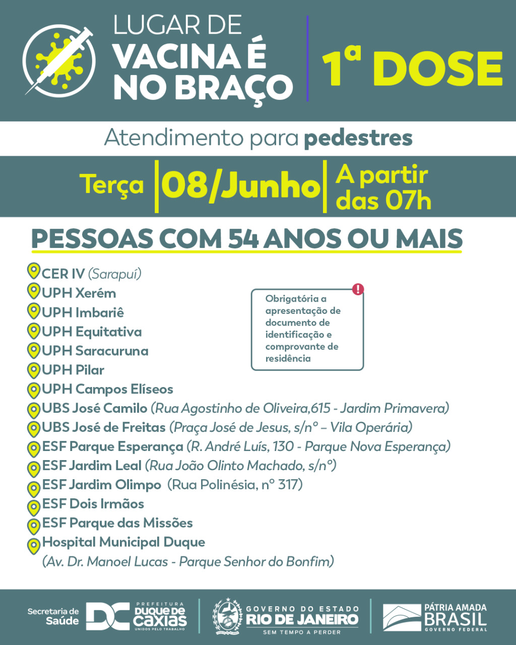A Prefeitura de Duque de Caxias segue com a vacinação por idade, nesta terça-feira (08/06), com a programação de primeira dose para pessoas de 54 anos ou mais. O município está aplicando o calendário unificado, recomendado pelo Governo do Estado. Para receber a vacina é obrigatória a apresentação de documento de identificação e comprovante de residência.