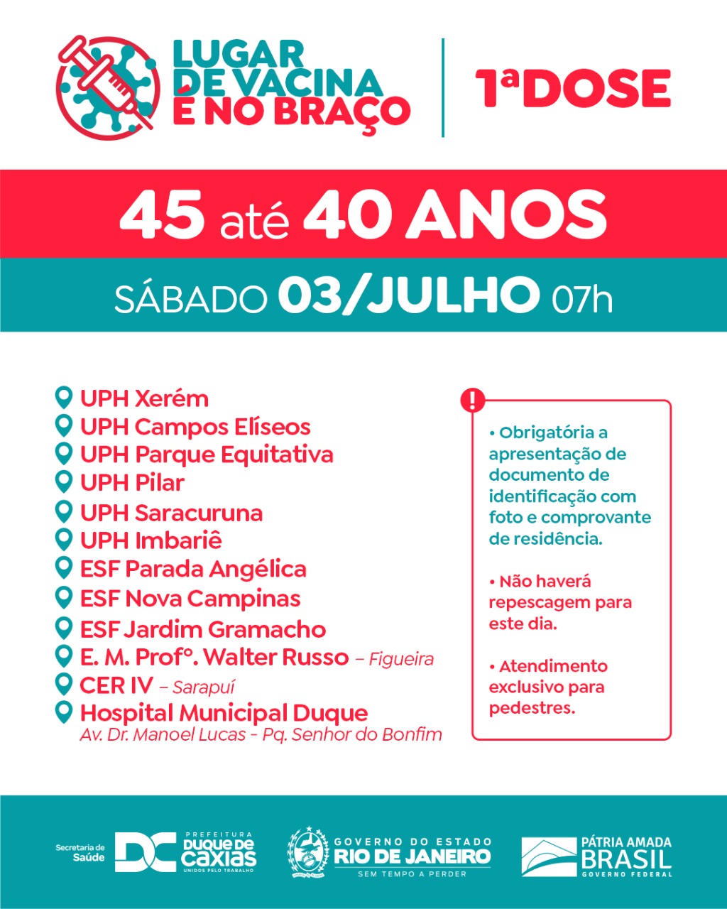 Neste sábado (03/07) a Prefeitura de Duque de Caxias realiza vacinação com a primeira dose somente para quem tem idade entre 45 e 40 anos. A Secretaria Municipal de Saúde alerta que neste dia não serão vacinadas pessoas que estiverem fora dessa faixa etária. Para receber a primeira dose da vacina é obrigatório a apresentação de documento de identificação com foto e comprovante de residência.