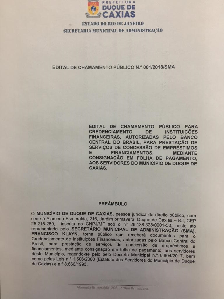 EDITAL DE CHAMAMENTO PÚBLICO PARA CREDENCIAMENTO DE INSTITUIÇÕES FINANCEIRAS, AUTORIZADAS PELO BANCO CENTRAL DO BRASIL, PARA PRESTAÇÃO DE SERVIÇOS DE CONCESSÃO DE EMPRÉSTIMOS E FINANCIAMENTOS, MEDIANTE CONSIGNAÇÃO EM FOLHA DE PAGAMENTO, AOS SERVIDORES DO MUNICÍPIO DE DUQUE DE CAXIAS