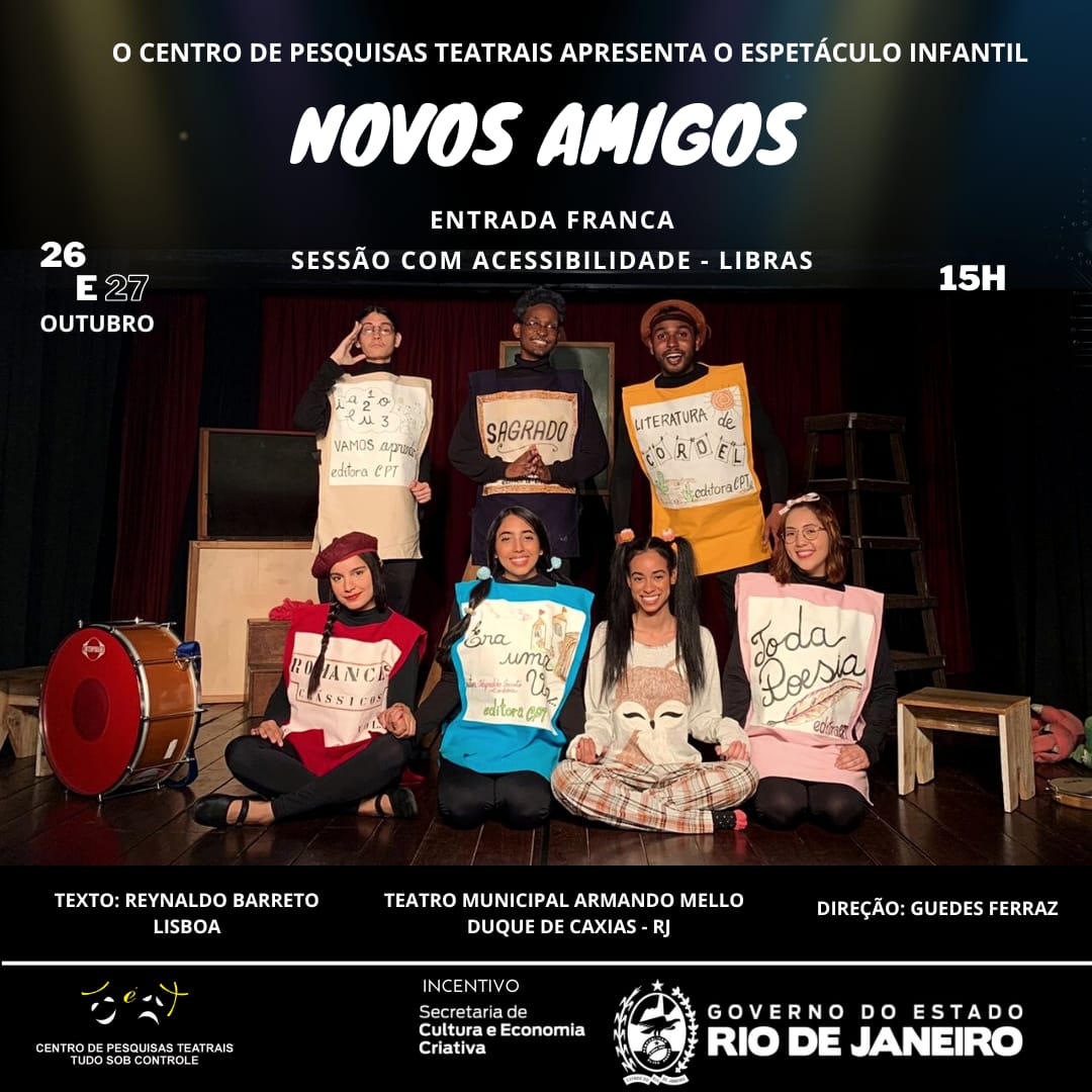 O Centro de Pesquisas Teatrais, companhia de teatro de Duque de Caxias, em atividade desde 1993, convida para as apresentações da peça infantil ‘Novos Amigos’, nos dias 26 e 27 de outubro, às 15h, no Teatro Municipal Armando Mello, no Centro de Duque de Caxias. O espetáculo vai passar também pelos municípios de Magé, Belford Roxo e São João de Meriti. A entrada é gratuita.