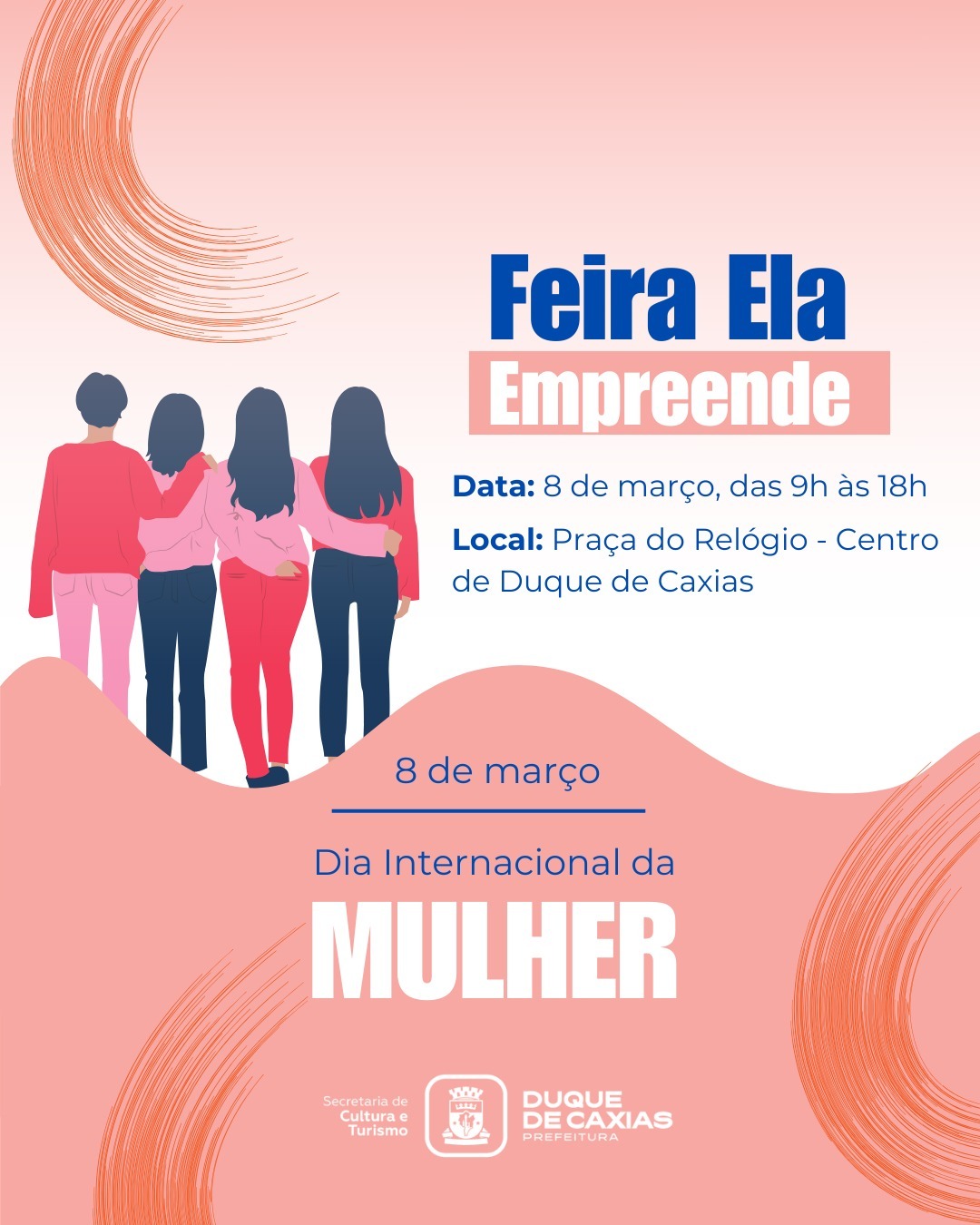 Em comemoração ao Dia Internacional da Mulher, celebrado em 8 de março, a Feira ‘Ela Empreende’ vai levar, neste sábado (8), das 9h às 18h, à Praça do Relógio, no Centro de Duque de Caxias, arte, moda e gastronomia.