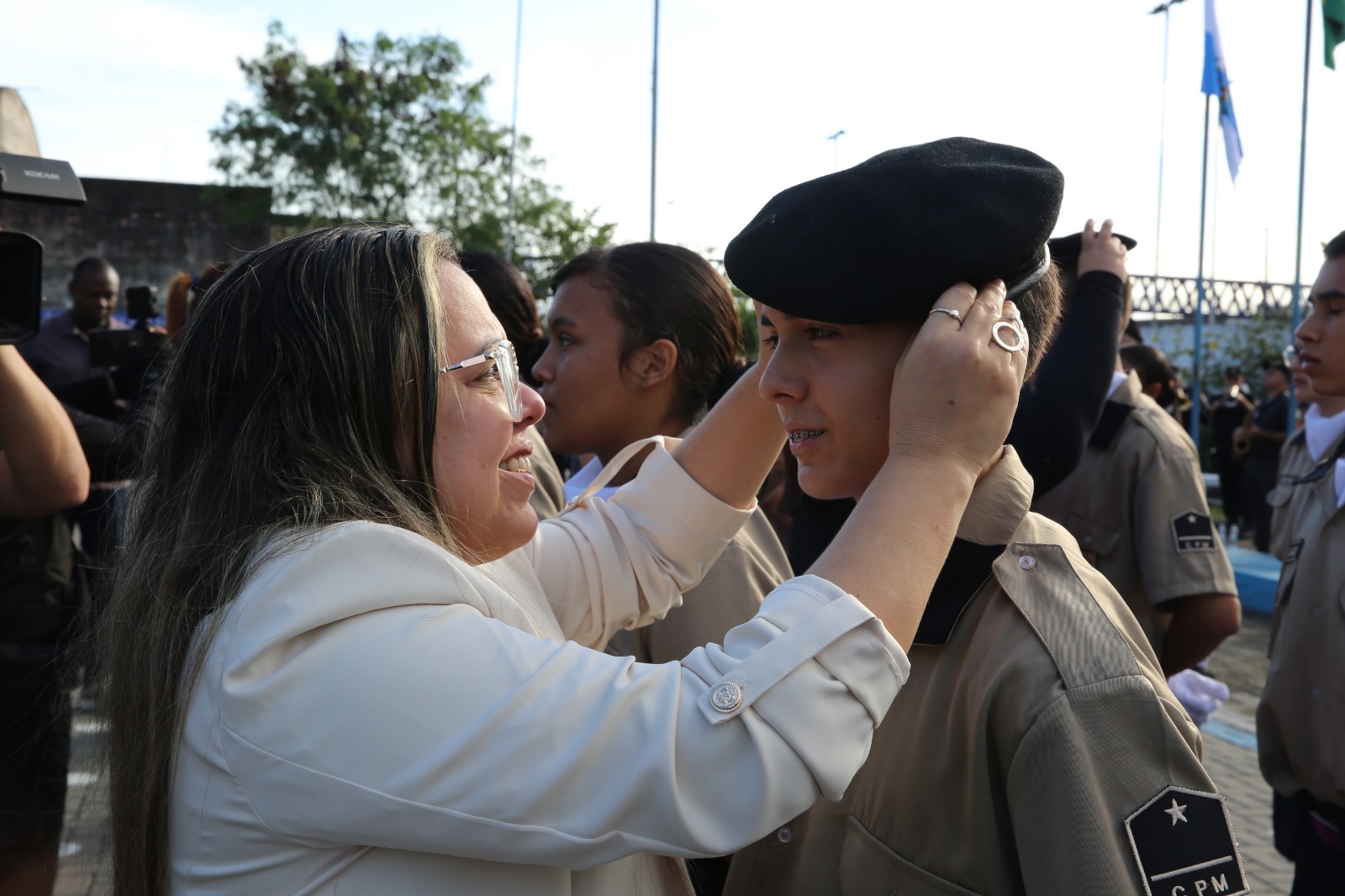 Nesta segunda-feira (03/07), o lll Colégio da Polícia Militar, campus Duque de Caxias, realizou a solenidade de entrega de boinas aos 17 novos alunos aprovados no concurso para o 1º Ano do Ensino Médio. A cerimônia marca o período de adaptação das aulas e simboliza a incorporação dos estudantes às tradições de honra e patriotismo cultivadas na instituição de ensino.