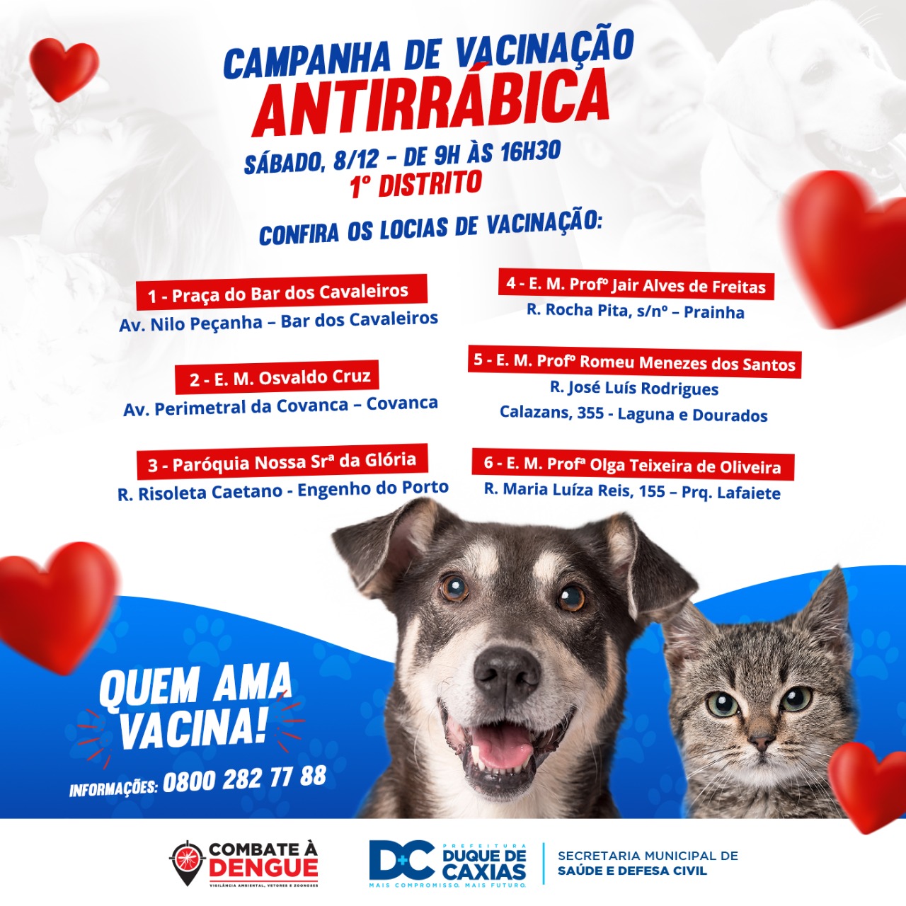 A Secretaria de Saúde de Duque de Caxias, através da Superintendência de Vigilância Ambiental e Zoonoses, promove neste sábado, 08 de dezembro, das 9h às 16h, mutirão de combate à Dengue, Zika e Chikungunya e campanha de vacinação contra a raiva animal, no bairro Bar dos Cavaleiros, primeiro distrito.