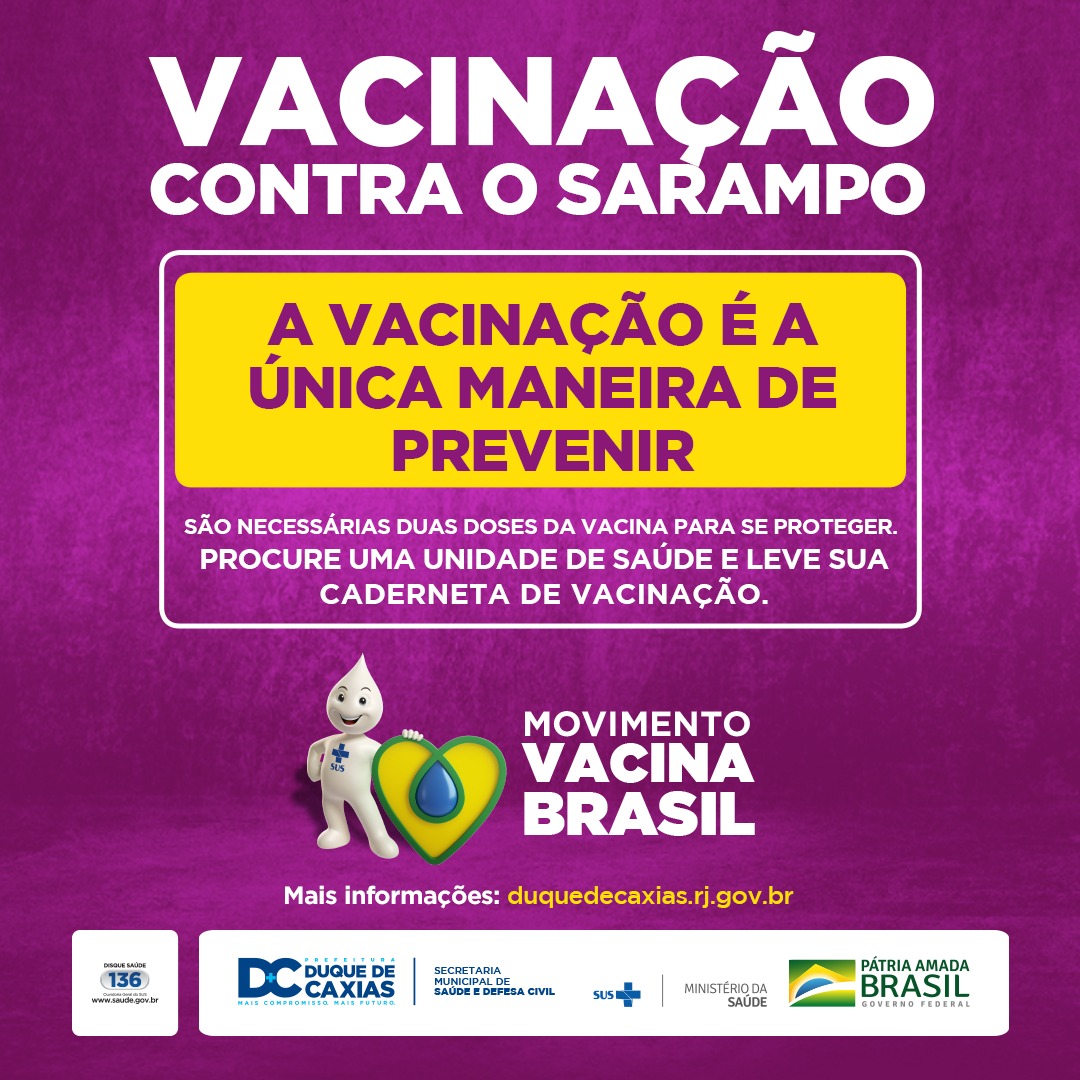 A Secretaria Municipal de Saúde e Defesa Civil de Duque de Caxias informa que, nesta quinta-feira (30) haverá mutirão de vacinação contra o sarampo nas Praças do Pacificador (Centro) e Praça da Apoteose (Vila São Luiz), das 8h às 13h.