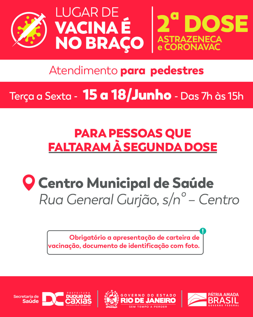 Nesta quarta-feira (16), a Prefeitura de Duque de Caxias segue com a vacinação de segunda dose de Astrazeneca e Coronavac, para todos aqueles que não compareceram às convocações feitas pela Secretaria Municipal de Saúde. A vacinação acontece até a sexta-feira (18), das 7h às 15h, no Centro Municipal de Saúde – CMSDC (Av. General Gurjão, Centro). É obrigatória a apresentação do cartão de vacinação e documento de identificação.