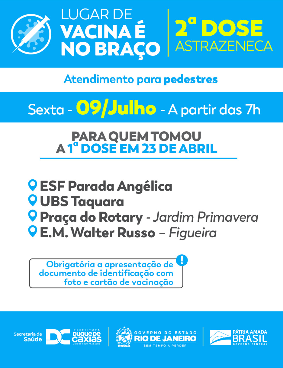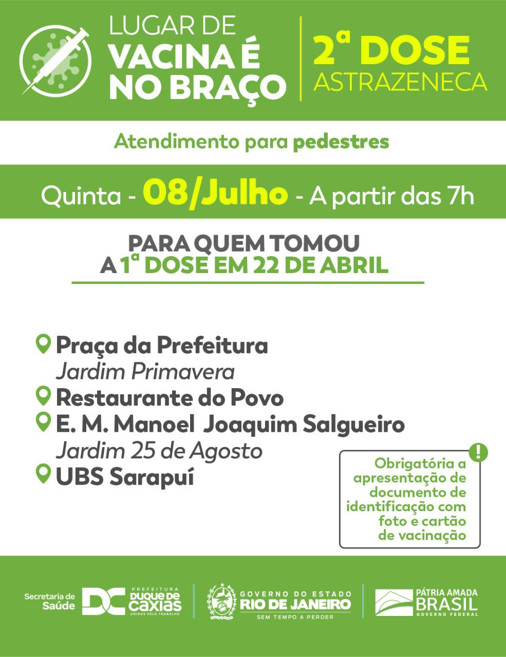 A Prefeitura de Duque de Caxias, através da Secretaria Municipal de Saúde, promove nesta quinta-feira (08) e sexta-feira (09), aplicação da segunda dose de Astrazeneca para quem recebeu a primeira nos dias 22 e 23 de Abril. É obrigatório a apresentação de carteira de vacinação e documento de identificação.